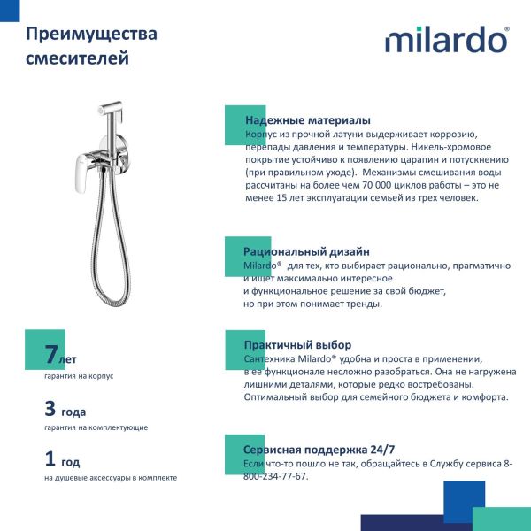 Смеситель с гигиеническим душем Rora отличается универсальным характером: основной акцент в его дизайне приходится на плавные линии корпуса и классическое цветовое решение. Держатель для лейки интегрирован в компактный корпус смесителя – удобно для санузлов небольшой площади. Простое рычажное управление позволяет управлять смесителем в одно движение. • Гигиеническая лейка из ABS-пластика и душевой шланг из ПВХ (1,5) идут в комплекте. • Качественный механизм смешивания воды смесителя Milardo® рассчитан на более чем 70 000 циклов работы – это не менее 15 лет эксплуатации семьей из трех человек. • Оптимальная толщина никель-хромового покрытия защищает смеситель от образования трещин и сколов, продлевает срок его службы. • Гарантия на смесители Milardo® – 7 лет, на картридж – 3 года, на душевые аксессуары – 1 год. (с) Авторский текст, сентябрь 2022 г.