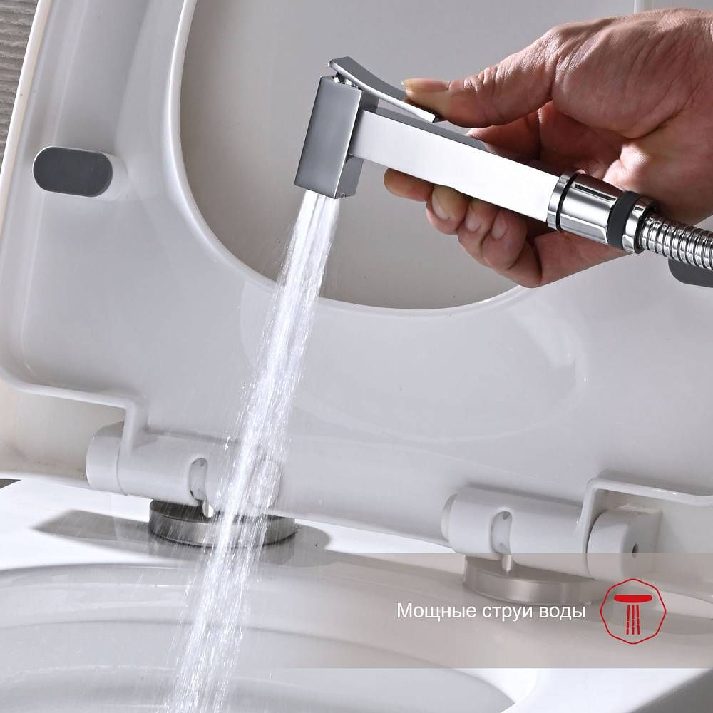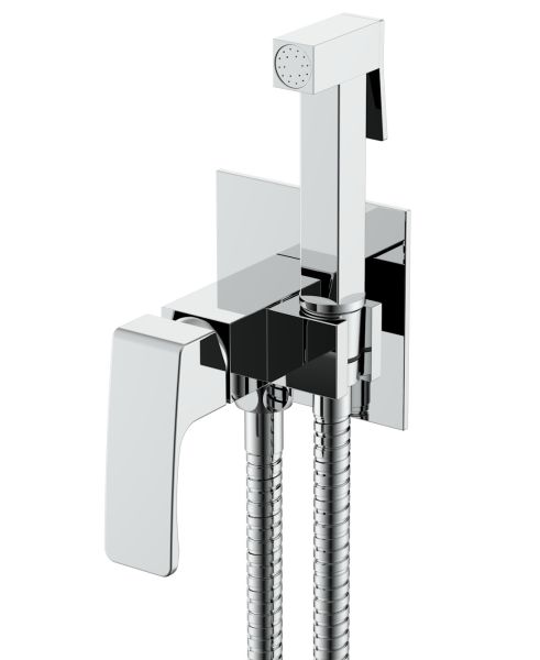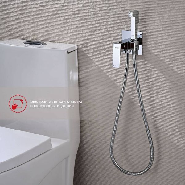 Качественный и современный смеситель с гигиеническим душем R01.52, одна рукоять для того, чтобы регулировать напор воды. Смеситель для биде устанавливается прямо внутрь стены, что позволит скрыть функциональные элементы, спрятать некоторые элементы монтажа. Латунная душевая лейка работает в одном режиме. Высокопрочный душевой шланг 1200 мм в оплетке двойного вальцевания с трубкой из синтетического каучука вращающийся на 360 градусов. Основной материал корпуса - латунь, проверенный временем материал, который обеспечивает идеальное напыление хромированного покрытия. Квадратная форма душ для биде делает его оригинальным и аутентичным.