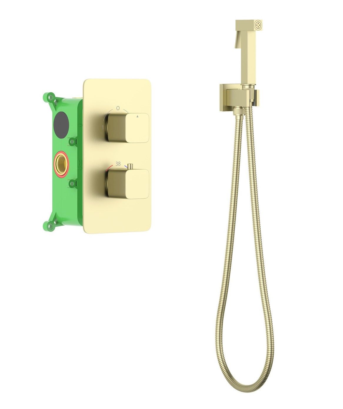 Цвет "матовое золото" никогда не выйдет из моды, во все времена драгоценный металл был признаком богатства. Встраиваемый смеситель с гигиеническим душем и термостатом Timo Petruma 5089 предназначен для монтажа в твердой или полой стене. Основные преимущества встроенного смесителя: элегантный внешний вид, все коммуникации и крепления спрятаны в стену, снаружи видны только декоративные элементы. Установить встроенный смеситель можно в любом месте. Регулировка температуры воды осуществляется ручкой термостата (расположена снизу), термостатический картридж поддерживает стабильную температуру воды. Управление смесителем осуществляется поворотом ручки (расположена сверху) влево. В положнии верхней ручки 12:00 смеситель выключен. Длины шланга 1,2 метра хватает для решения гигиенических задач. Можно также использовать например, для мытья собаки после прогулки или наполнения ведра воды и т.д. Смеситель отлично сочетается с инсталляцией для унитаза. Сложностей монтажа не возникает при установке смесителя опытным сантехником. Внимательно изучите инструкцию по монтажу и эксплуатации.