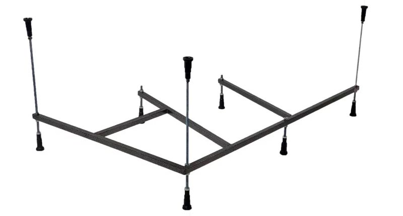 Усиленный цельносварной стальной каркас для ванны изготовлен из квадратного металлического профиля 2х2 см и окрашен темно-бронзовой молотковой краской. Каркас имеет 8 ножек и 4 опоры в борт ванны снизу. Предназначен для использования во влажных помещениях.