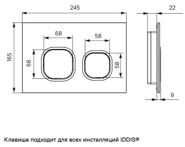 Черная клавиша IDDIS® Unifix составит базовый комплект с подвесной сантехникой – изделие совместимо со всеми моделями инсталляций IDDIS®. Хромированный контур квадратных кнопок выступает ярким акцентом, превращая функциональный продукт в стильный аксессуар. Плоская и эстетичная клавиша смыва займет пространство размером не более ежедневника (24,5 на 16,5 см). Она легко монтируется и снимается для удобного доступа к крану открытия-закрытия воды и обслуживания арматуры. Для данной модели доступно несколько цветовых сочетаний.