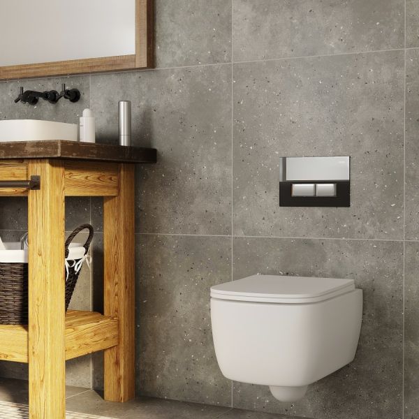 Универсальная клавиша смыва. Материал: стекло. Цвет: черный. Хромированные кнопки Крепежная рама в комплекте. Упаковка: картонная коробка.