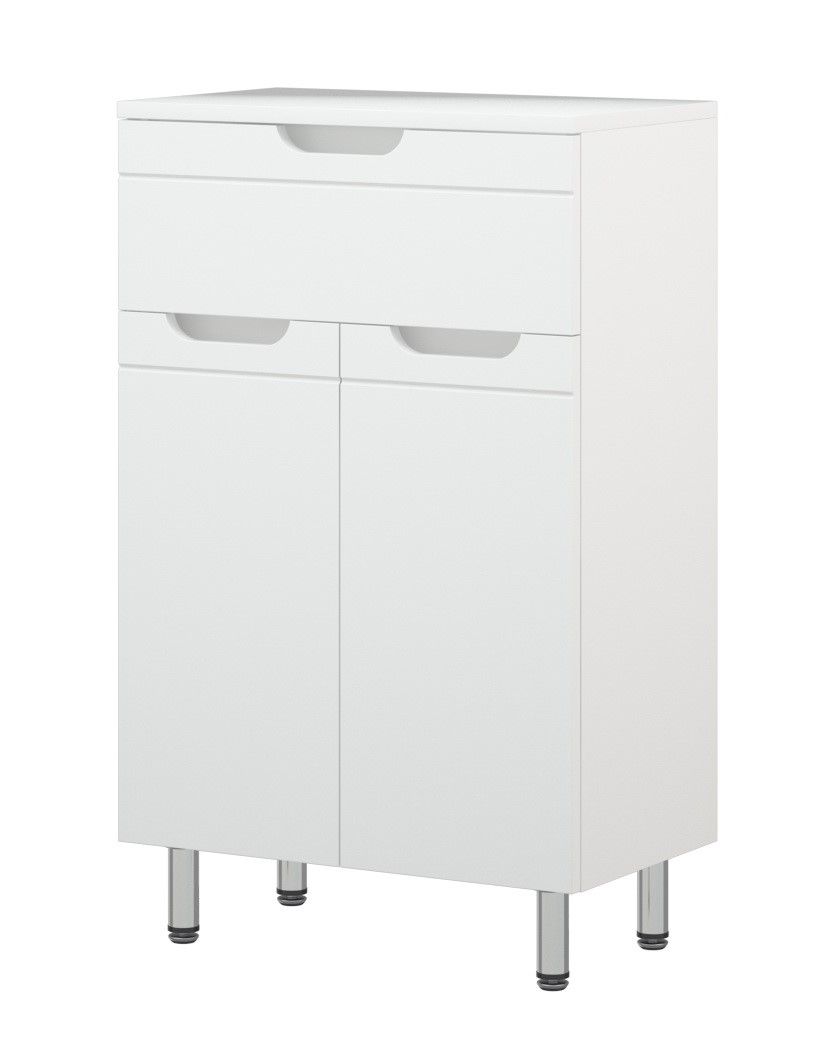 Комод Corozo Лея, 50 см, белый, SD-00001510Коллекция мебели для ванных комнат "ЛЕЯ" создана для тех, кто ценит простоту форм, сочетание округлых и прямых линий, удобство эксплуатации. У мебели коллекции «ЛЕЯ» корпус выполнен из ЛДСП, фасады - из влагостойкой плиты МДФ, покрытие – пленка ПВХ. Мебель оснащена доводчиками. Комод представлен в напольном варианте исполнения на четырех металлических опорах. У модели один выдвижной ящик высотой 110 мм и две распашные створки снизу. За створками одна регулируемая по высоте вкладная полка. Фурнитура с лицевой стороны фасадов отсутствует, вместо нее предусмотрены интегрированные ручки с декоративной полосой тонкой фрезеровки. Бесшумность и долговечность эксплуатации обеспечивают надёжные системы мягкого закрывания – роликовые направляющие и петли с доводчиками.