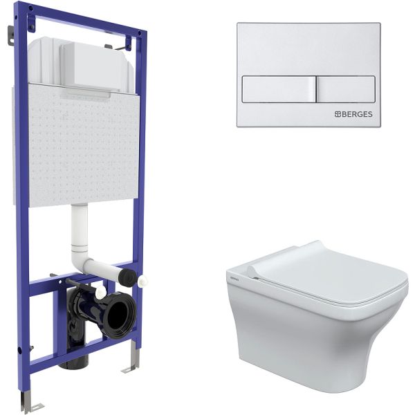 Комплект Berges 4в1 042453: инсталляция NOVUM кнопка L2 матовый хром унитаз Strati Rimless сиденье Strati Slim SO