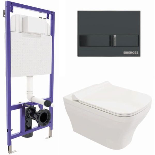 Комплект Berges 4в1 042454: инсталляция NOVUM кнопка L6 чёрный глянец унитаз Strati Rimless сиденье Strati Slim SO