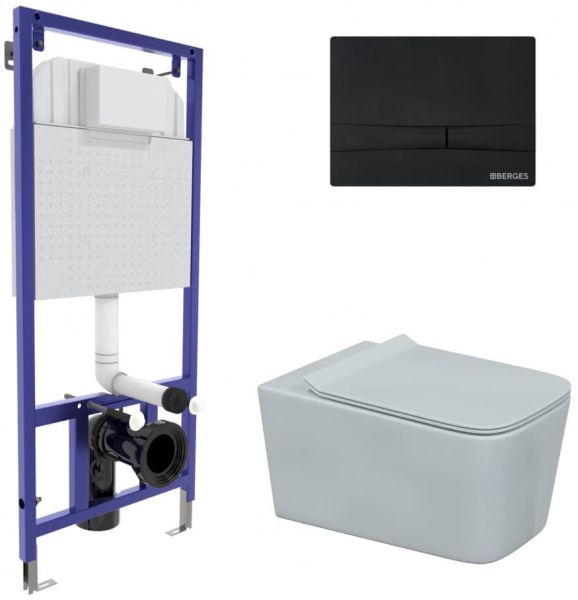 Полный комплект BERGES для монтажа подвесного унитаза. 1. Инсталляция NOVUM525Толщина бачка 80 мм.Межосевое расстояние под крепежные шпильки унитаза 18 и 23 см.Резервуар воды объемом 10 литров с тепло-шумоизоляцией.Уровень шума при давлении 3 бар не превышает 13 дБ.Подвод воды сверху (G1/2 наружная).Объем смыва 3/6 литра с возможностью регулировки. Металлический каркас, окрашенный антикоррозийной эмалью, расчетная нагрузка до 400 кг.Ножки регулировки высоты из оцинкованной стали. Возможность установки в угол. 2. кнопка F5 Soft Touch чернаяABS-пластик 3. унитаз Floe Rimless,безободковая система смыва, антибактериальное покрытиеэкономия воды, скрытый крепеж 4. сиденье дюропласт Floe Slim SOмикролифт, быстросъем. Все крепежи для установки в комплекте