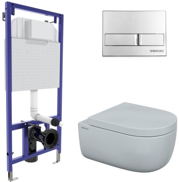 Полный комплект BERGES для монтажа подвесного унитаза. 1. Инсталляция NOVUM525Толщина бачка 80 мм.Межосевое расстояние под крепежные шпильки унитаза 18 и 23 см.Резервуар воды объемом 10 литров с тепло-шумоизоляцией.Уровень шума при давлении 3 бар не превышает 13 дБ.Подвод воды сверху (G1/2 наружная).Объем смыва 3/6 литра с возможностью регулировки. Металлический каркас, окрашенный антикоррозийной эмалью, расчетная нагрузка до 400 кг.Ножки регулировки высоты из оцинкованной стали. Возможность установки в угол. 2. кнопка L3 хром глянецABS-пластик 3. унитаз EGO XL Rimless,безободковая система смыва, антибактериальное покрытиеэкономия воды, скрытый крепеж 4. сиденье дюропласт Toma SOмикролифт, быстросъем. Все крепежи для установки в комплекте