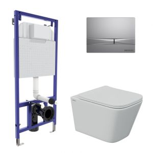 Полный комплект BERGES для монтажа подвесного унитаза. 1. Инсталляция NOVUM525Толщина бачка 80 мм.Межосевое расстояние под крепежные шпильки унитаза 18 и 23 см.Резервуар воды объемом 10 литров с тепло-шумоизоляцией.Уровень шума при давлении 3 бар не превышает 13 дБ.Подвод воды сверху (G1/2 наружная).Объем смыва 3/6 литра с возможностью регулировки. Металлический каркас, окрашенный антикоррозийной эмалью, расчетная нагрузка до 400 кг.Ножки регулировки высоты из оцинкованной стали. Возможность установки в угол. 2. кнопка F2 матовый хромABS-пластик 3. унитаз , FLOE S Rimlessбезободковая система смыва, антибактериальное покрытиеэкономия воды, скрытый крепеж 4. сиденье дюропласт Floe S Slim SOмикролифт, быстросъем Все крепежи для установки в комплекте