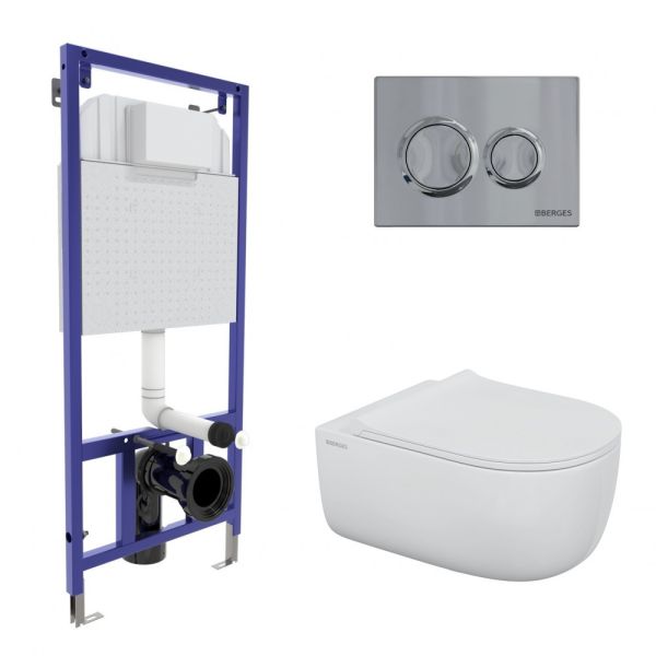 Комплект Berges 4в1 043302: инсталляция NOVUM 525 кнопка O3 хром глянец унитаз EGO XL Rimless сидение Okus Slim SO