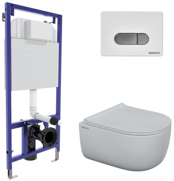 Полный комплект BERGES для монтажа подвесного унитаза. 1. Инсталляция NOVUM525Толщина бачка 80 мм.Межосевое расстояние под крепежные шпильки унитаза 18 и 23 см.Резервуар воды объемом 10 литров с тепло-шумоизоляцией.Уровень шума при давлении 3 бар не превышает 13 дБ.Подвод воды сверху (G1/2 наружная).Объем смыва 3/6 литра с возможностью регулировки. Металлический каркас, окрашенный антикоррозийной эмалью, расчетная нагрузка до 400 кг.Ножки регулировки высоты из оцинкованной стали. Возможность установки в угол. 2. кнопка D7 белая/хромABS-пластик 3. унитаз EGO Rimless,безободковая система смыва, антибактериальное покрытиеэкономия воды, скрытый крепеж 4. сиденье дюропласт Toma Slim SOмикролифт, быстросъем. Все крепежи для установки в комплекте