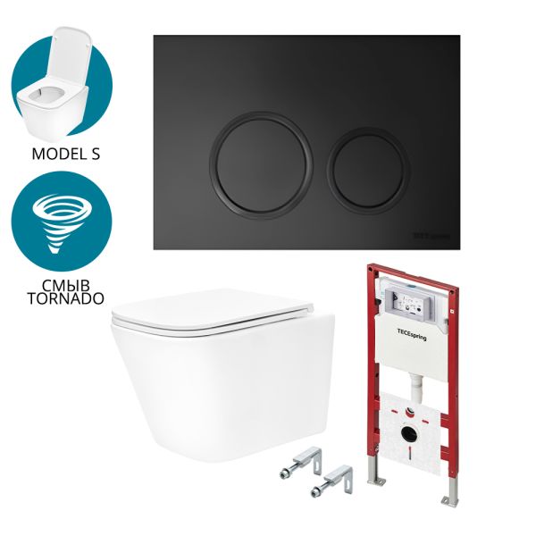 Комплект для установки подвесного унитаза: застенный модуль, панель смыва TECEspring R, черная матовая, унитаз TECEspring S
