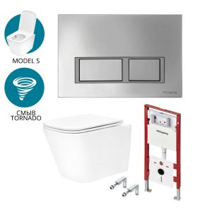 Комплект для установки подвесного унитаза: застенный модуль, панель смыва TECEspring V, хром глянцевый с хромированным контуром клавиш, унитаз TECEspring S