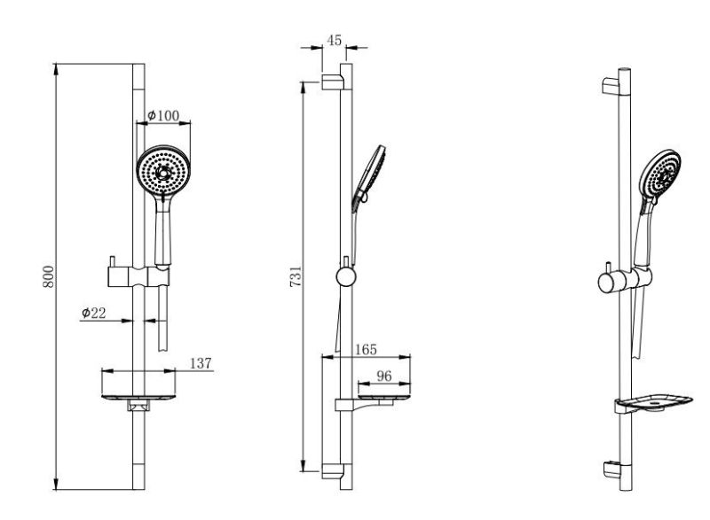 В комплекте: душевая штанга; держатель душевой лейки; душевая лейка ; душевой шланг из ПВХ ; мыльница; монтажный комплект