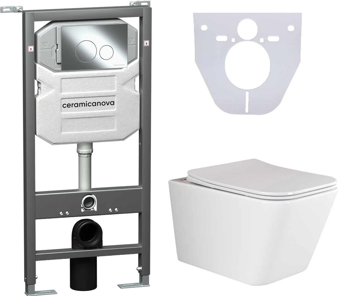Сет 4 в 1: CN3007_1001CH_1000Подвесной унитаз Metric Rimless арт. CN3007Шумоизоляционная панель для инсталляции арт. CN1000Система инсталляции для унитазов CERAMICANOVA Envision с кнопкой смыва Round цвет хром и креплениями, арт. CN1001CH Подвесной безободковый унитаз Ceramica Nova Metric Rimless, крышка микролифт, CN3007