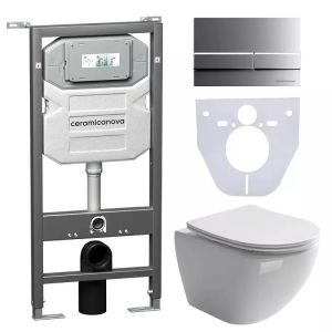 Сет 4 в 1: CN4002_1002M_1000Подвесной унитаз Metropol Rimless арт. CN4002Шумоизоляционная панель для инсталляции арт. CN1000Система инсталляции для унитазов CERAMICANOVA Envision с кнопкой смыва Flat цвет хром матовый, креплениями, арт. CN1002M Подвесной унитаз Metropol Rimless CN4002, глубокий смыв, с крепежом для полностью скрытого монтажа, ультра тонким с сидением и крышкой с функцией плавного закрытия, дюропласт.