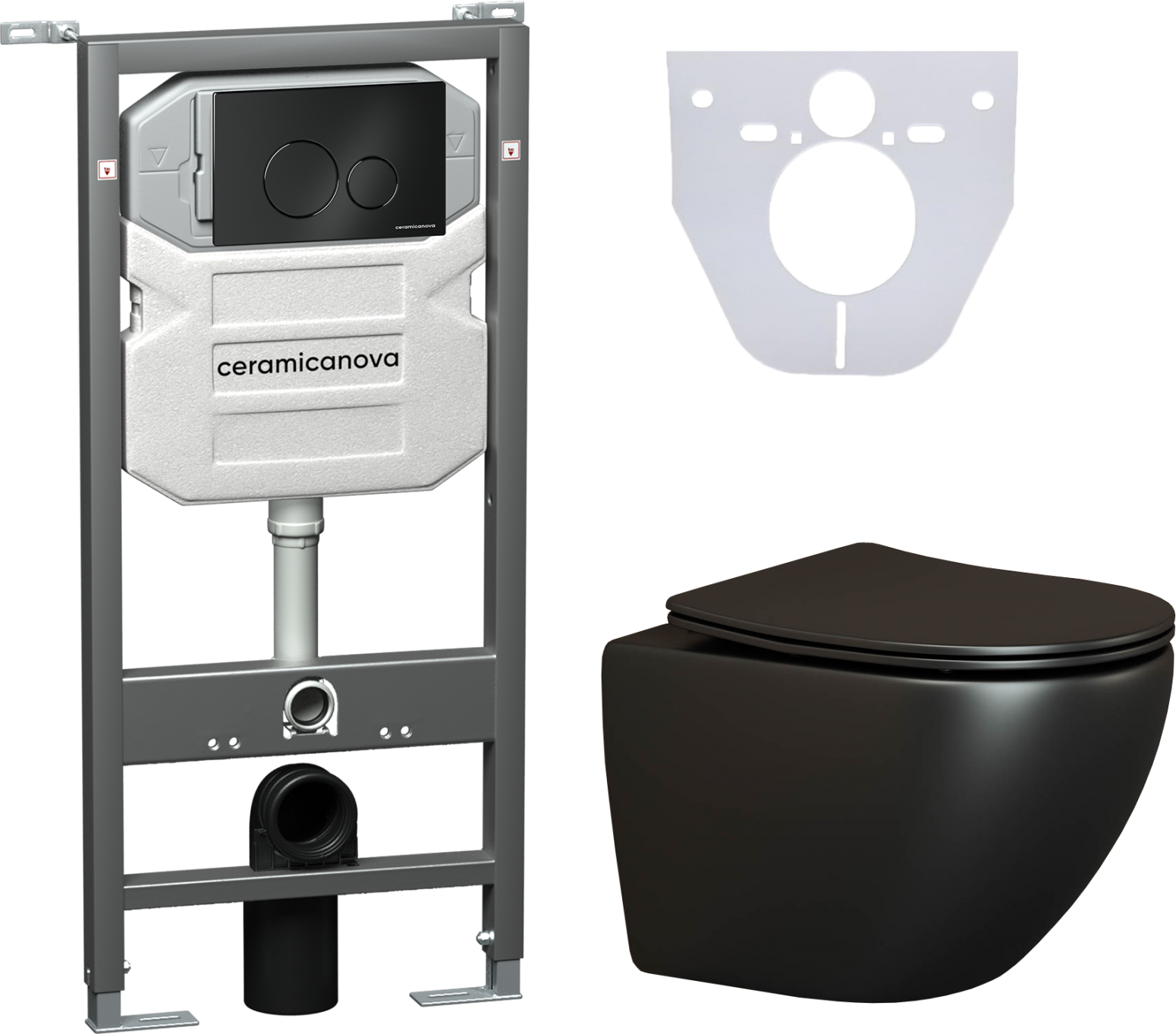Сет 4 в 1: CN4002MB_1001B_1000Подвесной унитаз Metropol Rimless арт. CN4002MBШумоизоляционная панель для инсталляции арт. CN1000Система инсталляции для унитазов CERAMICANOVA Envision с кнопкой смыва Round цвет чёрный матовый и креплениями, арт. CN1001B Подвесной безободковый унитаз Ceramica Nova Metropol Rimless черный матовый, сиденье микролифт, CN4002MB