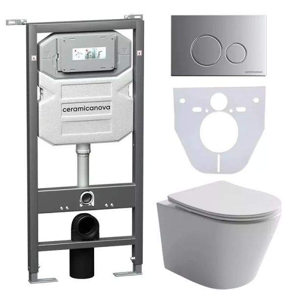 Сет 4 в 1: CN6000_1001M_1000Подвесной унитаз Balearica Rimless арт. CN6000Шумоизоляционная панель для инсталляции арт. CN1000Система инсталляции для унитазов CERAMICANOVA Envision с кнопкой смыва Round цвет хром матовый и креплениями, арт. CN1001M Подвесной унитаз Balearica Rimless CN6000, глубокий смыв, с крепежом для полностью скрытого монтажа, ультра тонким с сидением и крышкой с функцией плавного закрытия, дюропласт