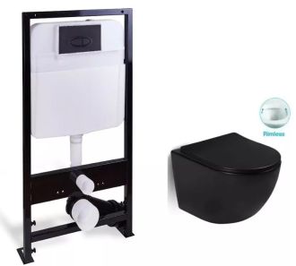 Комплект SantiLine SL-5018MB+SL-03 безободковый чёрный матовый унитаз с сиденьем микролифт и инсталляция с клавишей смыва чёрный матовый