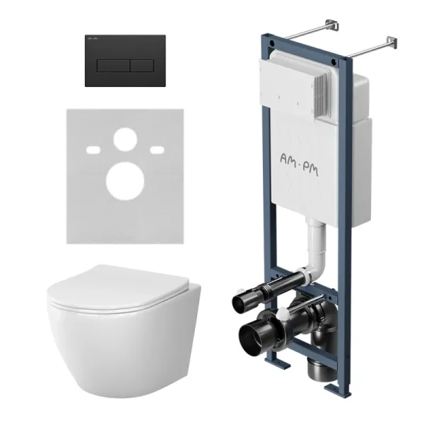 Комплект унитаза с инсталляцией AM.PM Like IS110338.801900 с сиденьем Микролифт и клавишей смыва чернойМаксимально полный комплект поставки, включающий все необходимые крепления, патрубки, звукоизолирующую прокладку. Экономия пространства благодаря узкой раме 352 мм шириной. Подходит даже для самых малогабаритных ванных комнат. Заливной клапан с низким уровнем шума - Класс II, согласно европейского стандарта EN 14124. Выдерживает нагрузку до 400 кг. Подходит для унитазов любых размеров. Высокая прочность и износостойкость Увеличенная толщина профиля, двойные прокладки слива и подачи воды Подключение воды сзади сверху. В комплекте механическая двухрежимная клавиша из ABS пластика в цвете черный матовый. Подвесной унитаз Like c технологией смыва AquaSpin. Новая инновационная система использует вихревой поток воды для самого эффективного очищения чаши унитаза. Эта технология обеспечивает более качественное омывание чаши, чем традиционные системы смыва, и при этом экономит воду до 50 %. Кроме того, она снижает уровень шума при смыве и исключает брызги воды, что делает использование унитаза более комфортным и гигиеничным. В комплекте быстросъемное сиденье из дюропласта с механизмом плавного закрывания. Материал сиденья дюропласт, устойчивый к появлению царапин, в сочетании с креплениями из нержавеющей стали гарантируют долговечность сиденья.