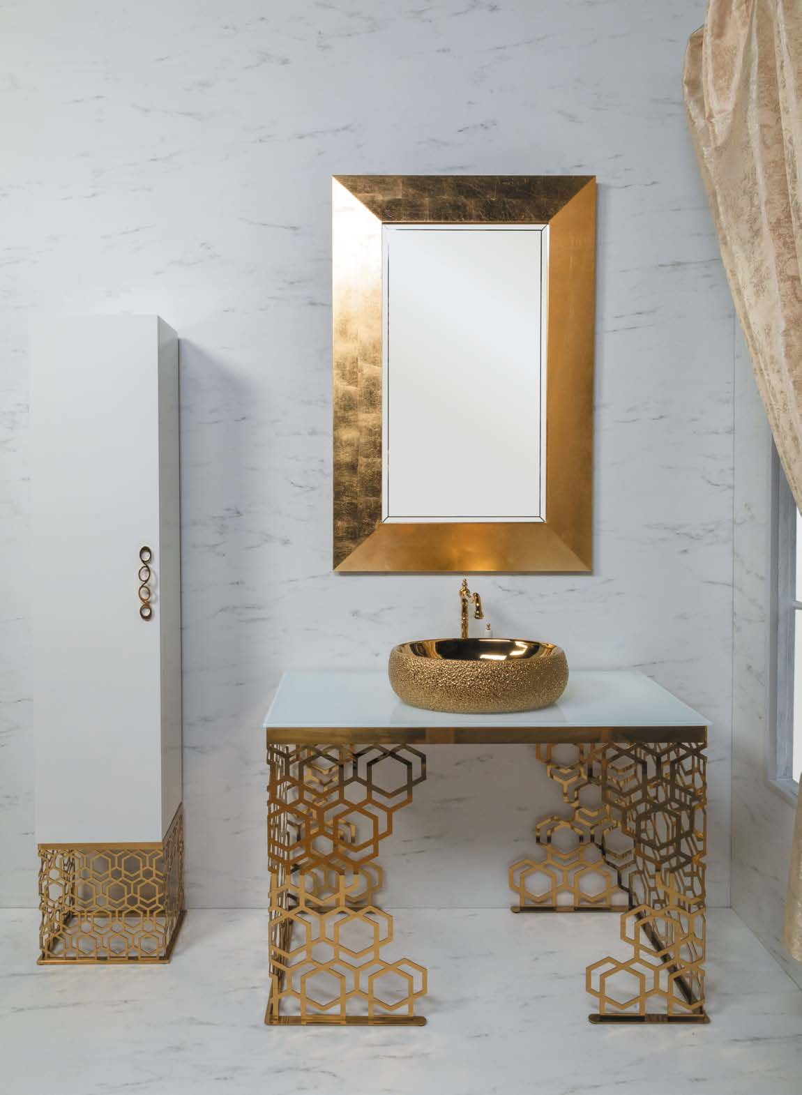 Консоль с раковиной Aura шириной 110 см цветом золото.Консоли произведены из нержавеющей стали благодаря чему стойки к коррозии. Гальваническое покрытие исполнено в цветах хром и золото. Можно выбрать столешницу из мрамора, хрустального каленого стекла в различных цветовых исполнениях, и Solid Glass (передовой материал, в состав которого входит мраморная крошка и стекло). Раковины-чаши выполнены из Corian, которыми можно дополнть консоли, хрустального стекла, керамики. Хорошим дополнением к консолям являются пеналы ArmadiArt, а также сифоны, клик-клаки и смесители Boheme.Мебель можно дополнить пеналом и зеркалом