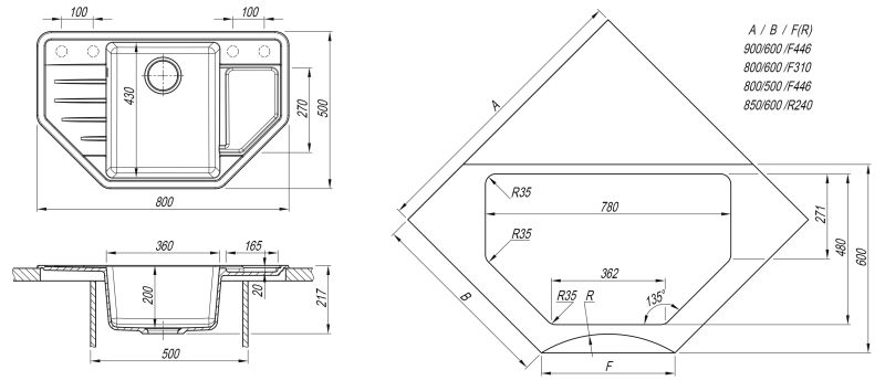 Угловая мойка с четкими контурами;Углубленное крыло;Гармоничный дизайн.Габариты нетто ( ДхШхВ) 800х500х217 мм.Кухонные мойки DR.GANS выдерживают температурные перепады в интервале от -40 до +110 С. Кипяток не повредит вашу мойку.