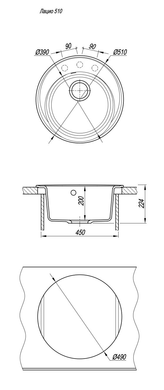 Круглая мойка с большой чашей для кухонного шкафа 45 смМатериал — кварцевый композитПредусмотрены дополнительные отверстия для установки аксессуаровГабариты нетто ( ДхШхВ) 510х510х217 мм
