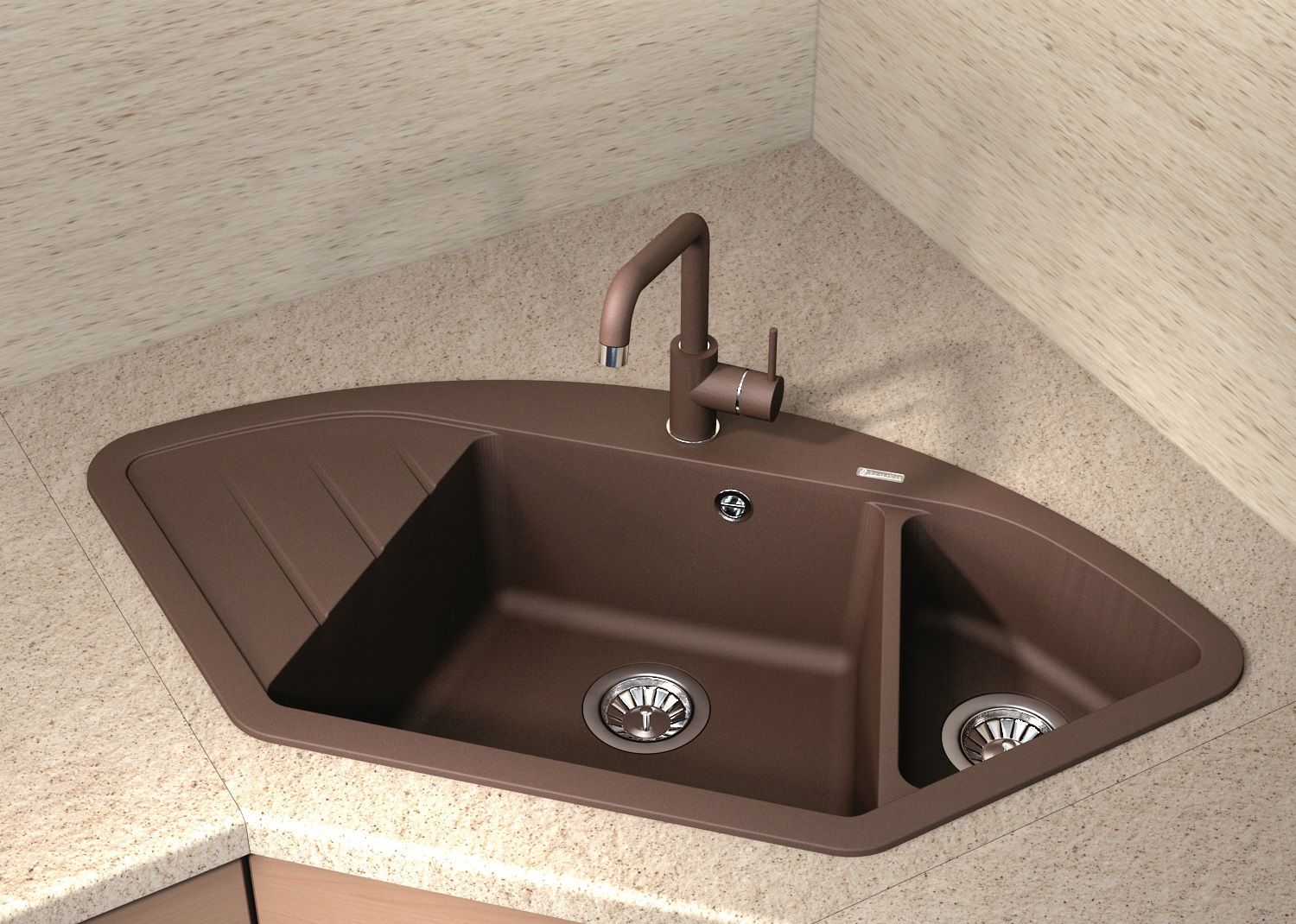 Угловая мойка классической формы с двумя чашами для кухни Florentina Веста изготовлена из композитного материала.