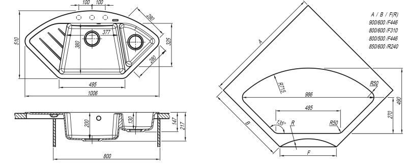 Комплектация: отводная арматура с переливом и выпуском для двух чаш, крепежи, шаблон под вырез.