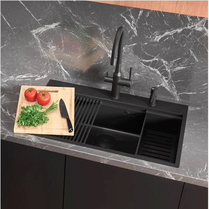 Кухонная мойка Lemark Iordana 780 9932120 в комплекте с разделочной доской ролл-матом и коландером чёрный матовый купить