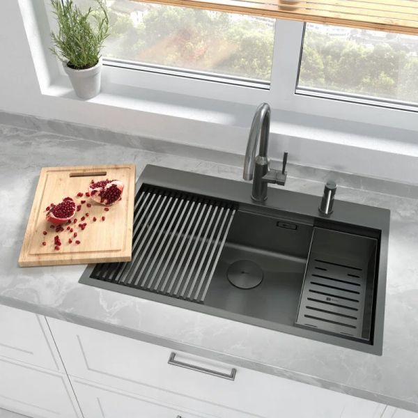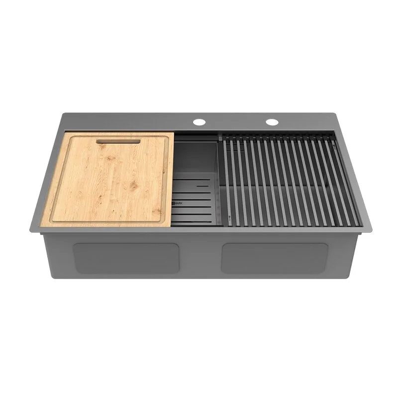 Мойка в комплекте с аксессуарами включает ролл-мат, коландер и разделочную доску, а ее ступенчатая форма позволяет устанавливать эти предметы прямо внутри чаши.