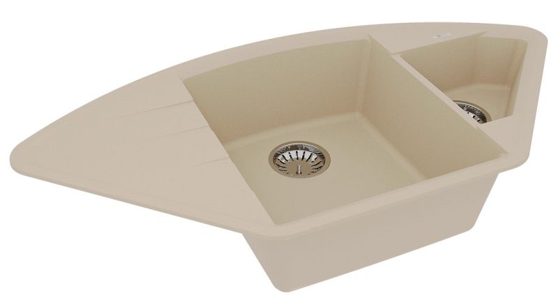 Благодаря своей форме, мойка подойдет как для кухонного гарнитура с подводкой воды в одном из углов помещения, так и для стандартного размещения в прямом шкафу. Эргономичная мойка с дополнительной чашей, которую можно использовать для мытья овощей и фруктов или для размораживания продуктов.