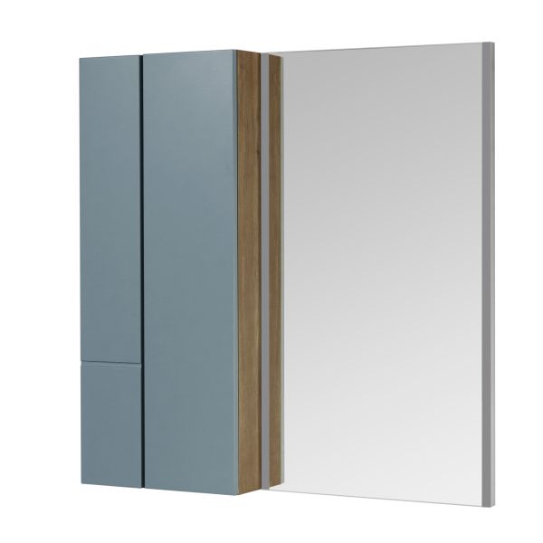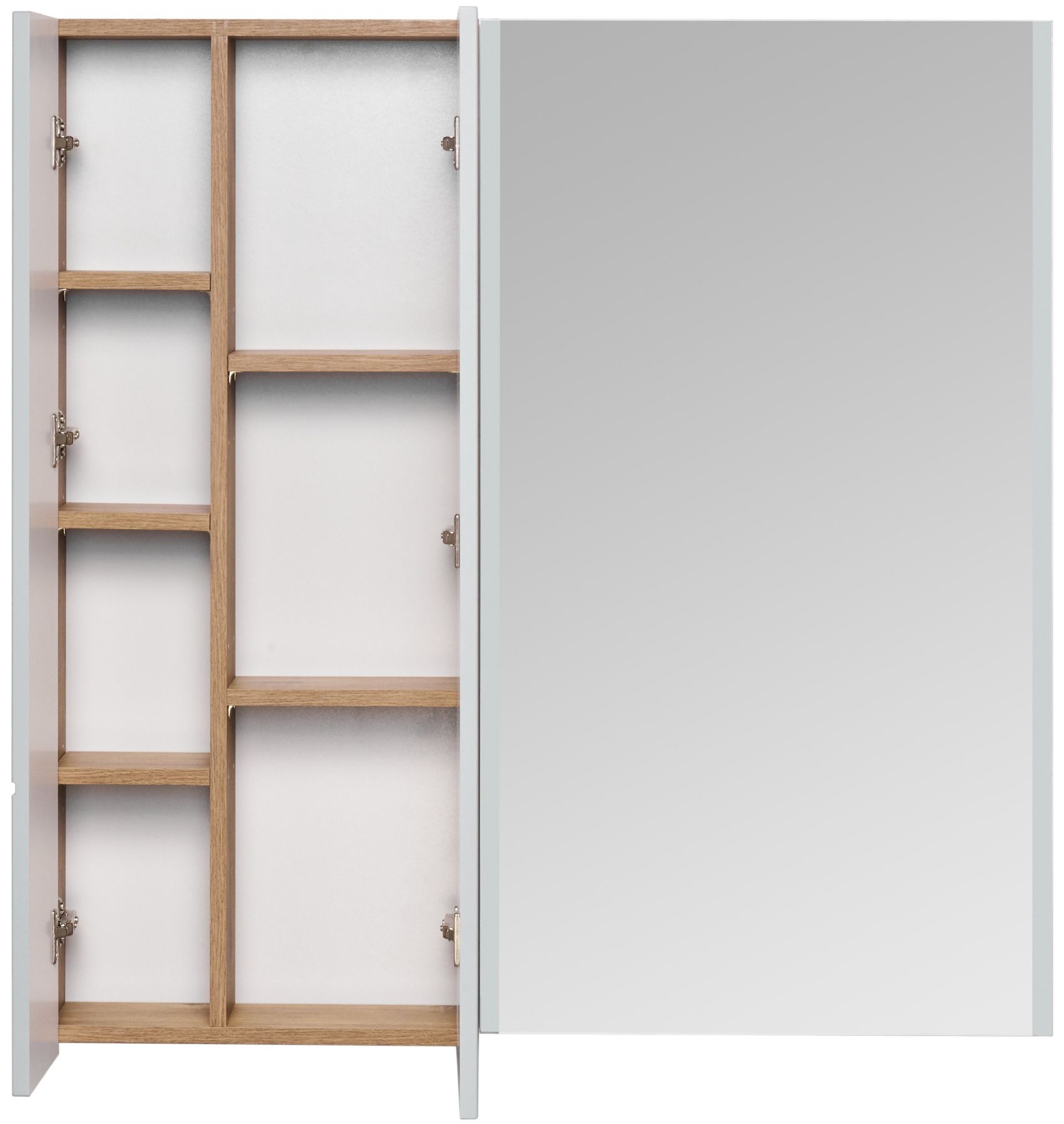 • Открывается модуль за фасад. Внутреннее пространство шкафчика поделено на ассиметричные секции, что позволяет разместить косметические различные косметические средства