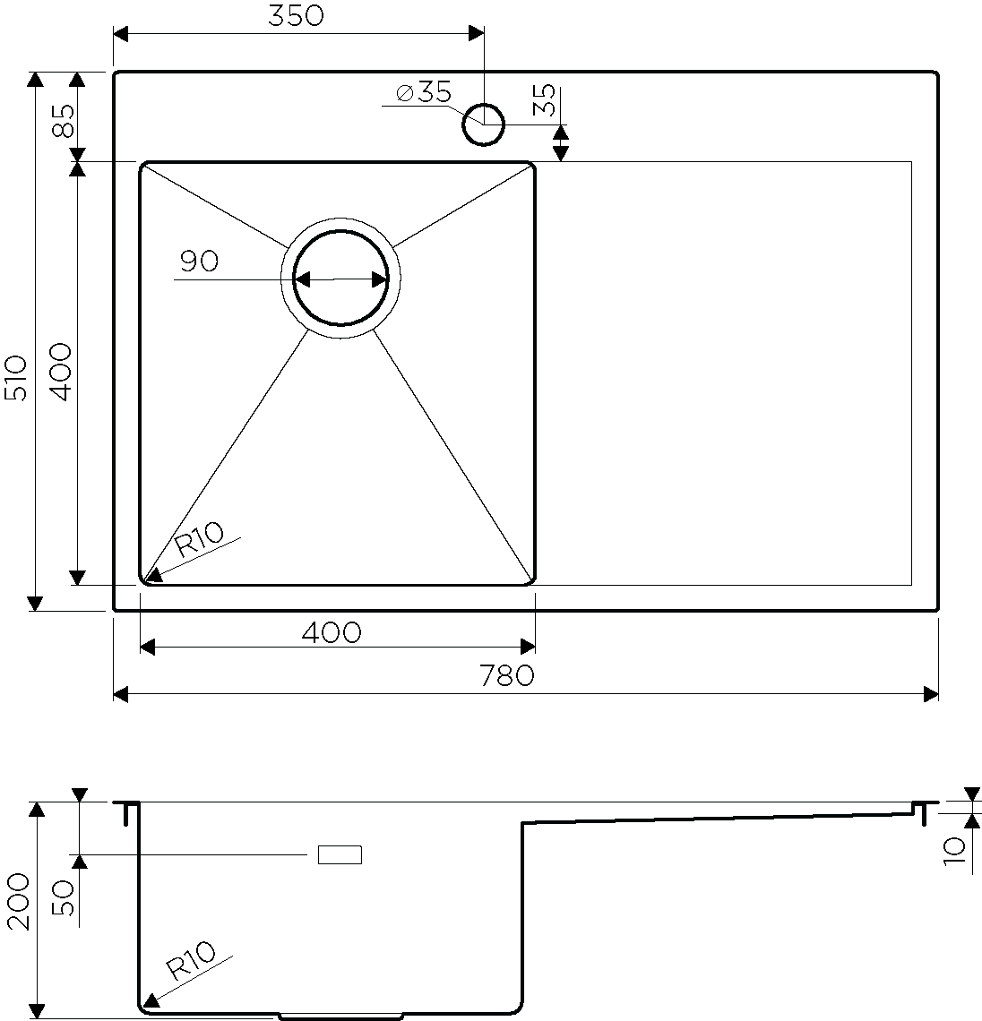 • Отверстия под смеситель:
