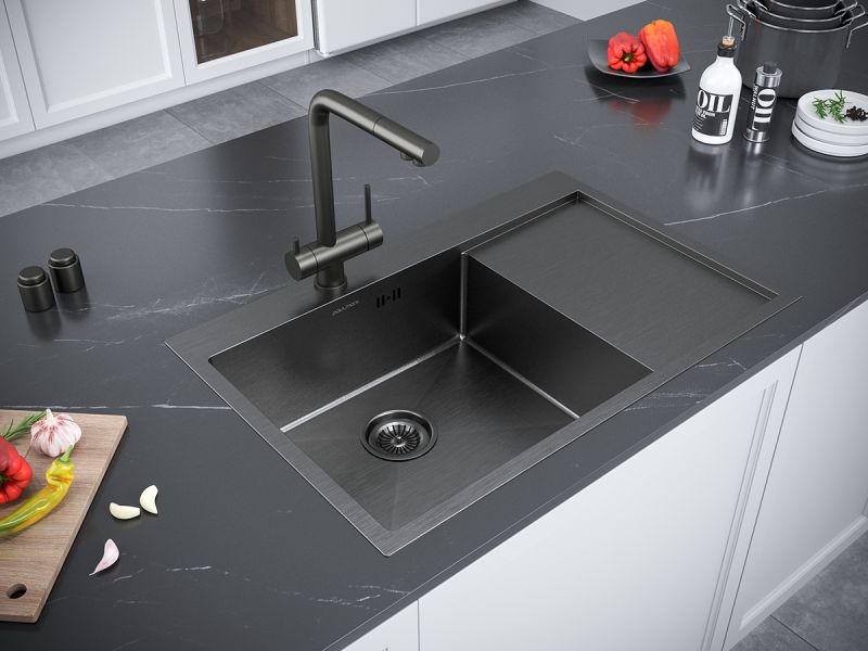 Мойки ATLAN L в оттенке GM имеeт прочное PVD покрытие, которое нанесено на нержавеющую сталь. Оно особенно устойчиво к появлению царапин и истиранию, не содержит микротрещин и является экологически чистым.Функциональное плоское крыло; Готовое отверстие для кухонного смесителя.Имеет шумопоглощающее покрытие Stille® на внешней стороне чаши;