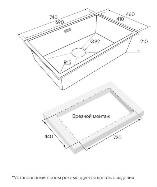 Мойка создана как для современного способа монтажа под столешницу, так и для классического врезного монтажа.