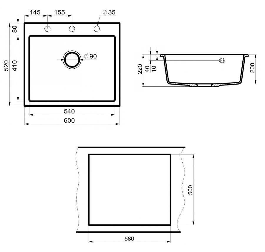 Отверстие под смеситель - нет, намечены 3 отверстия