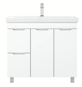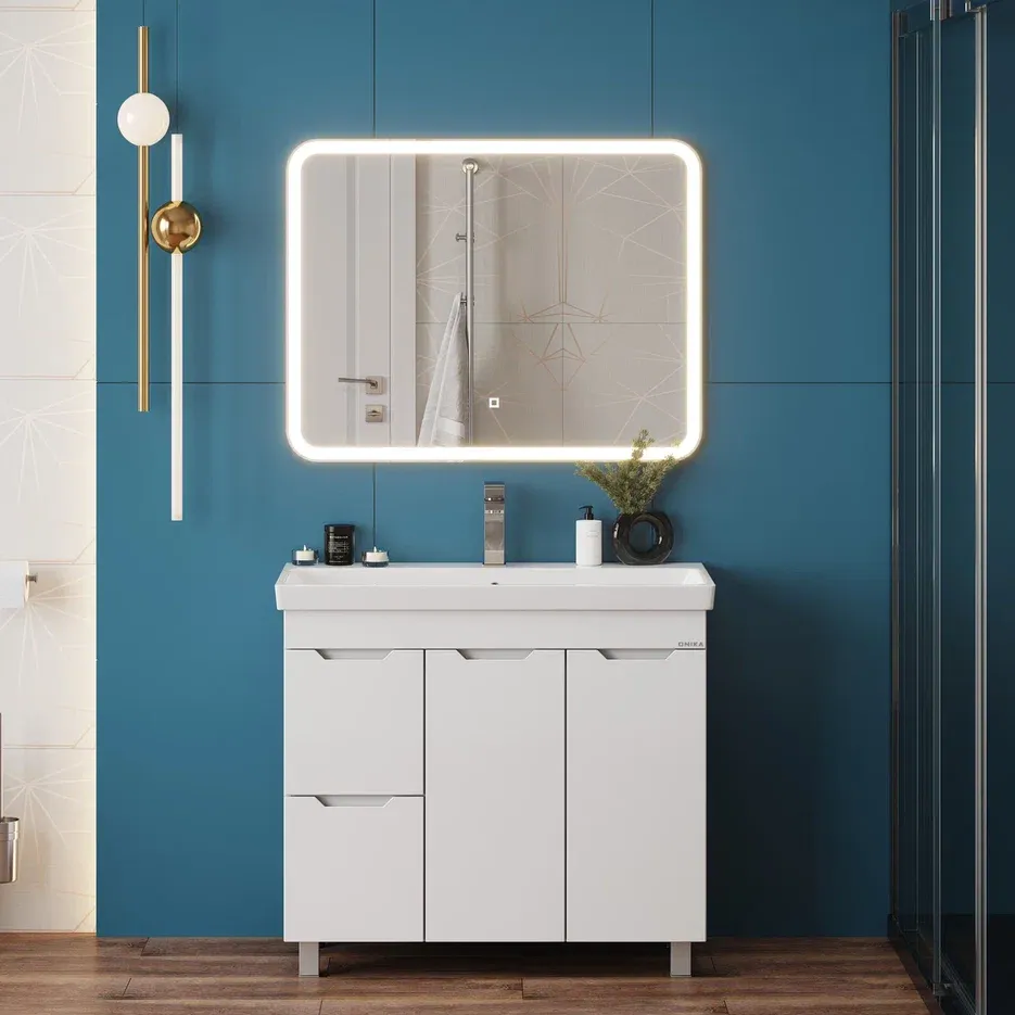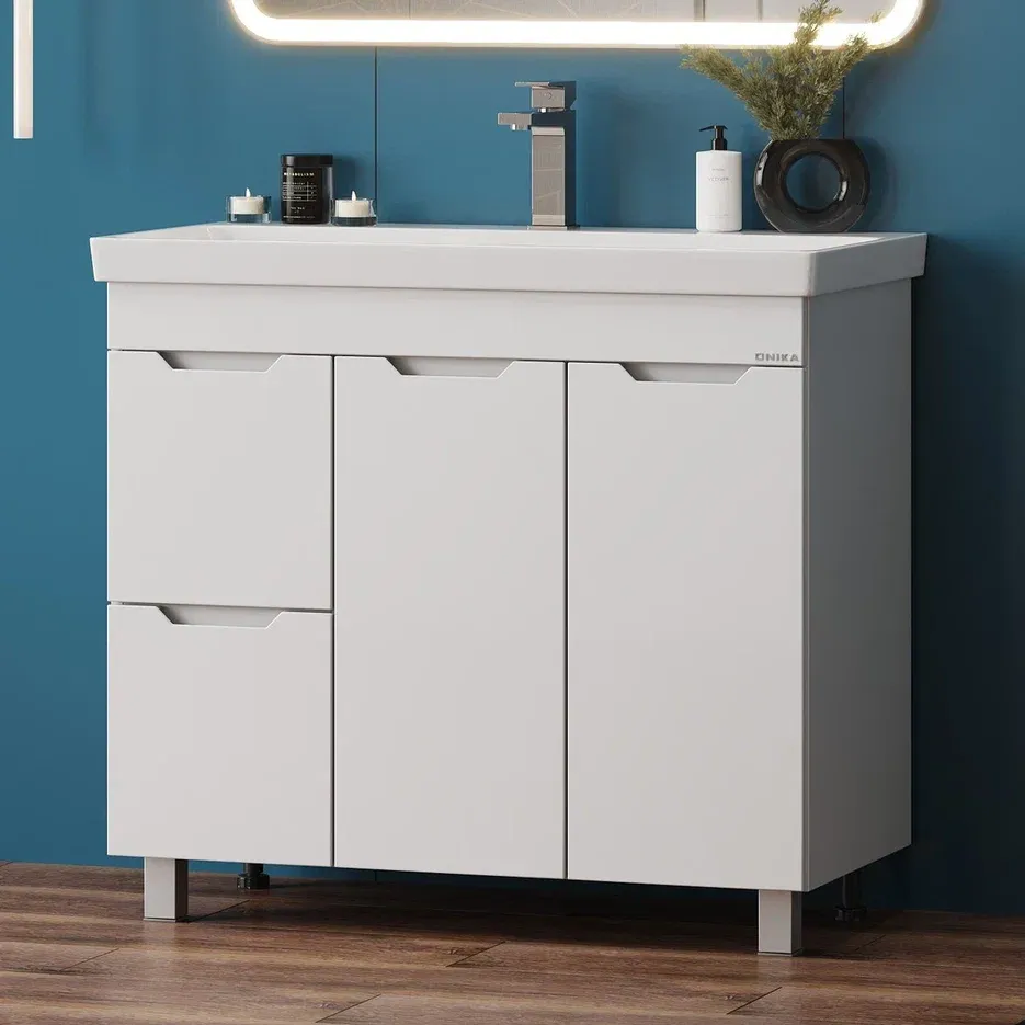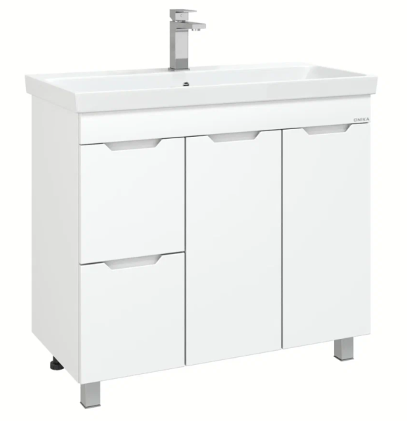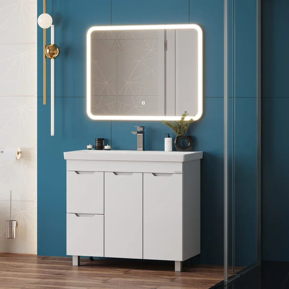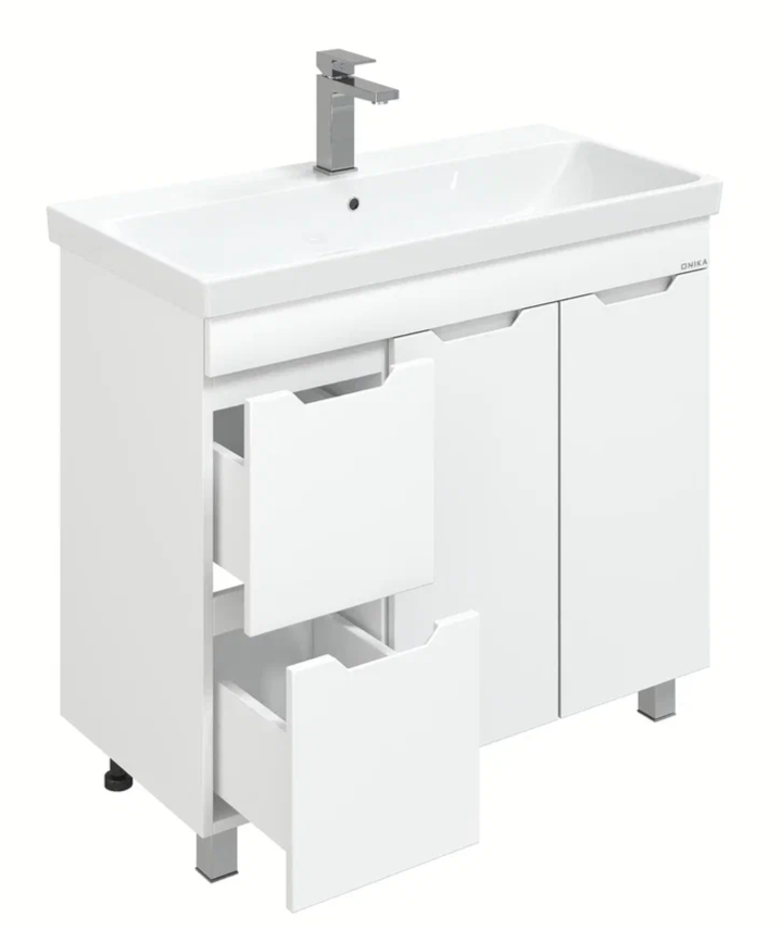 Напольная тумба для ванной комнаты Onika Айленд 90 сочетает в себе стильный минималистичный дизайн, белую глянцевую поверхность и высочайшее качество исполнения.