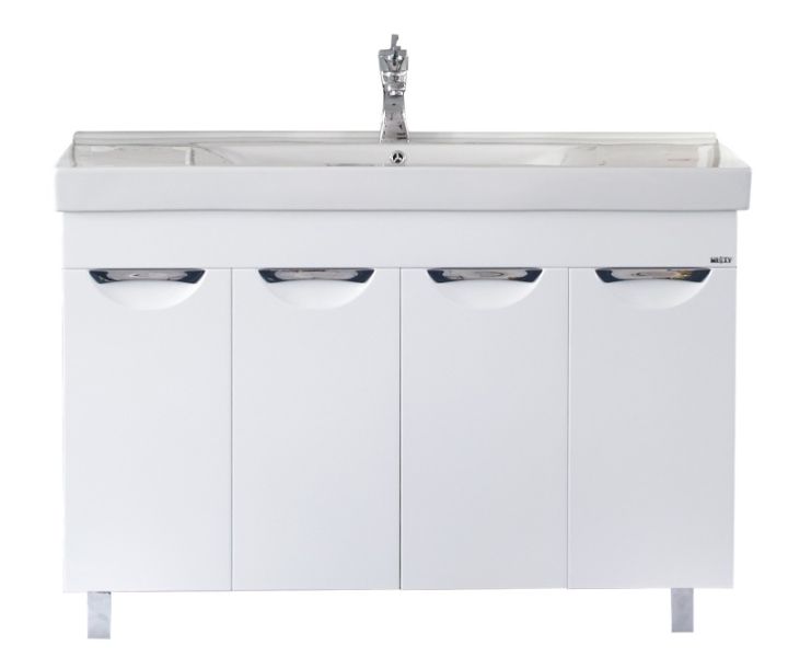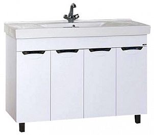1. Вместительной прямой тумбой с просторными отделениями за четырьмя распашными дверками. Модель поставляется в комплекте с прямоугольной доломитовой раковиной-столешницей MISTY 120 с одной чашей или раковиной STEP 120 с двумя чашами.