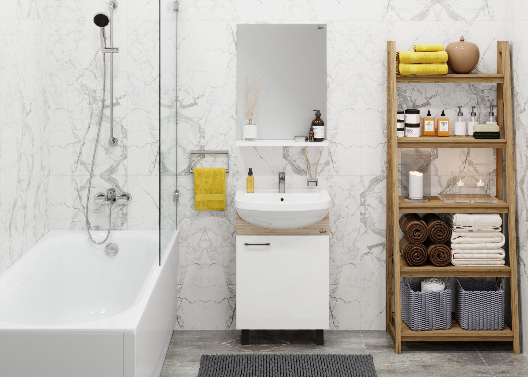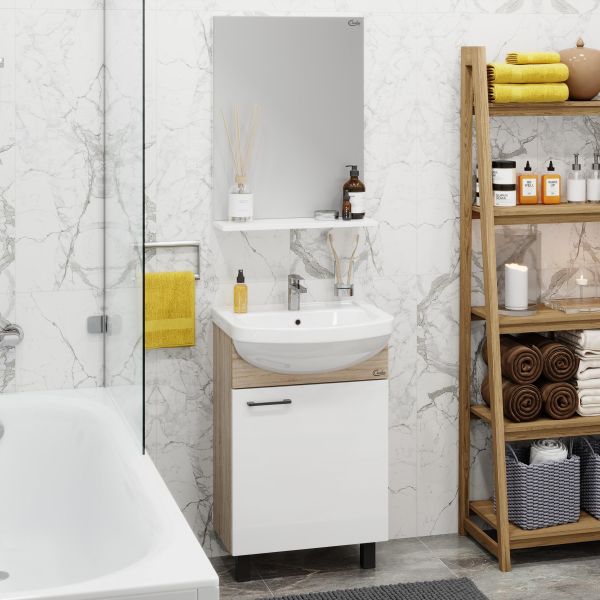 Компактные габариты позволяют грамотно организовать небольшой санузел, а белый фасад и корпус цвета дуба гармонично сочетаются с черной фурнитурой и отлично впишутся в интерьер любой ванной комнаты.
