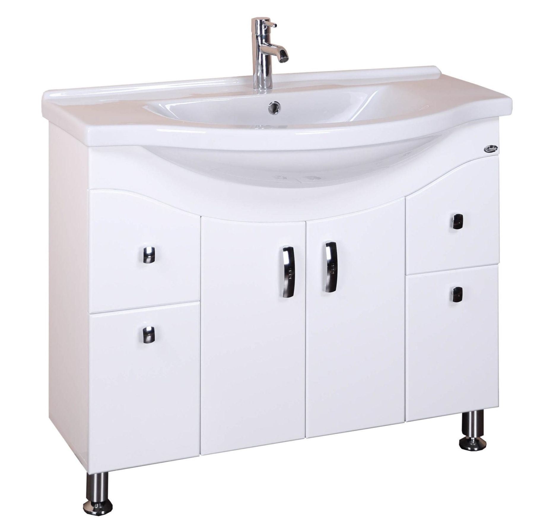 В тумбе Onika Эльбрус 100 белоснежный глянец фасада подчеркивается оригинальной хромированной фурнитурой и сложной изысканной геометрией линий.