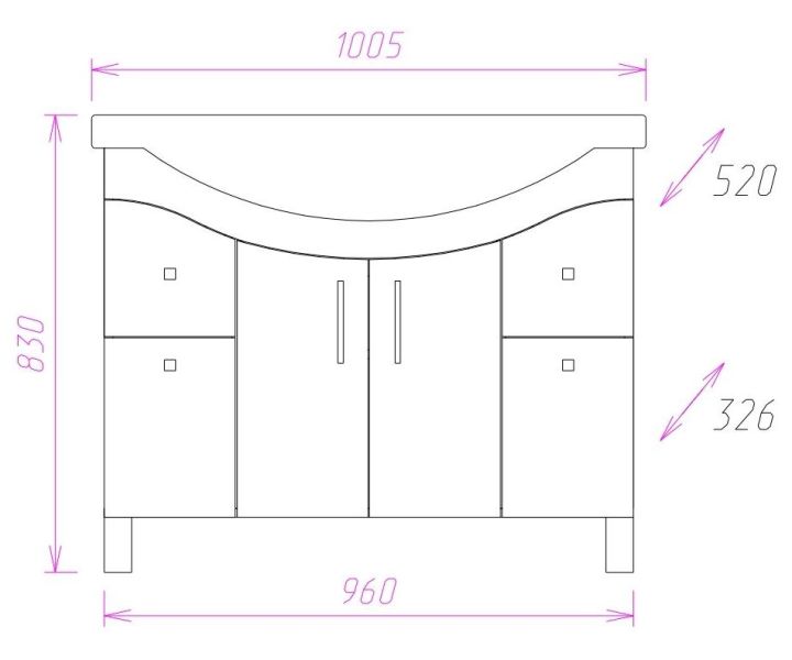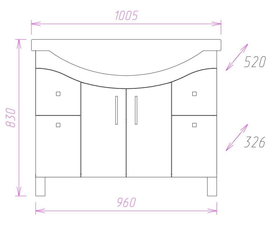 Размеры тумбы без учета раковины и ножек 96x33x68 cм.