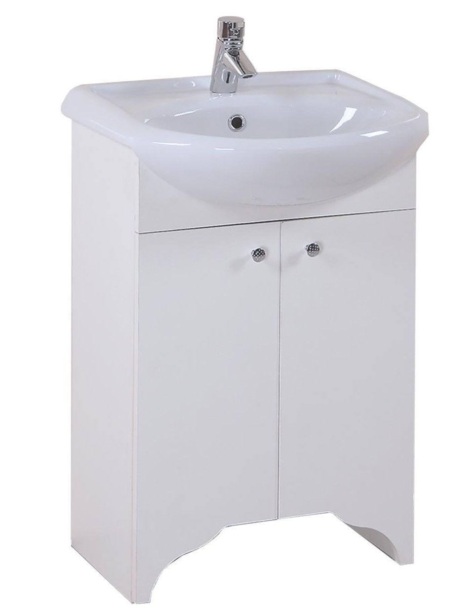 Яркие акценты тумбы - белоснежный фигурный фасад с оригинальной отделкой снизу и круглые хромированные ручки на распашных дверцах.