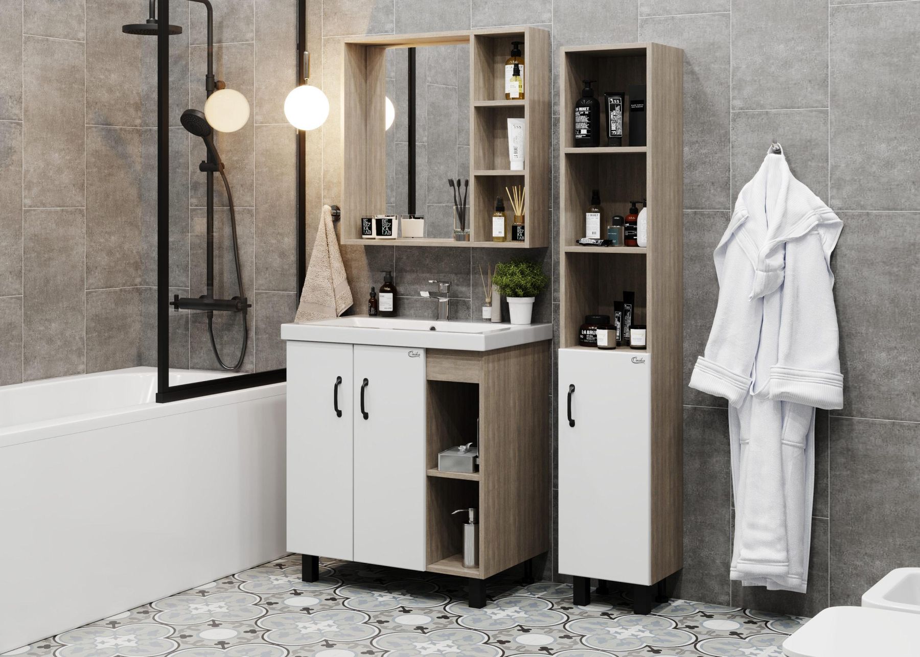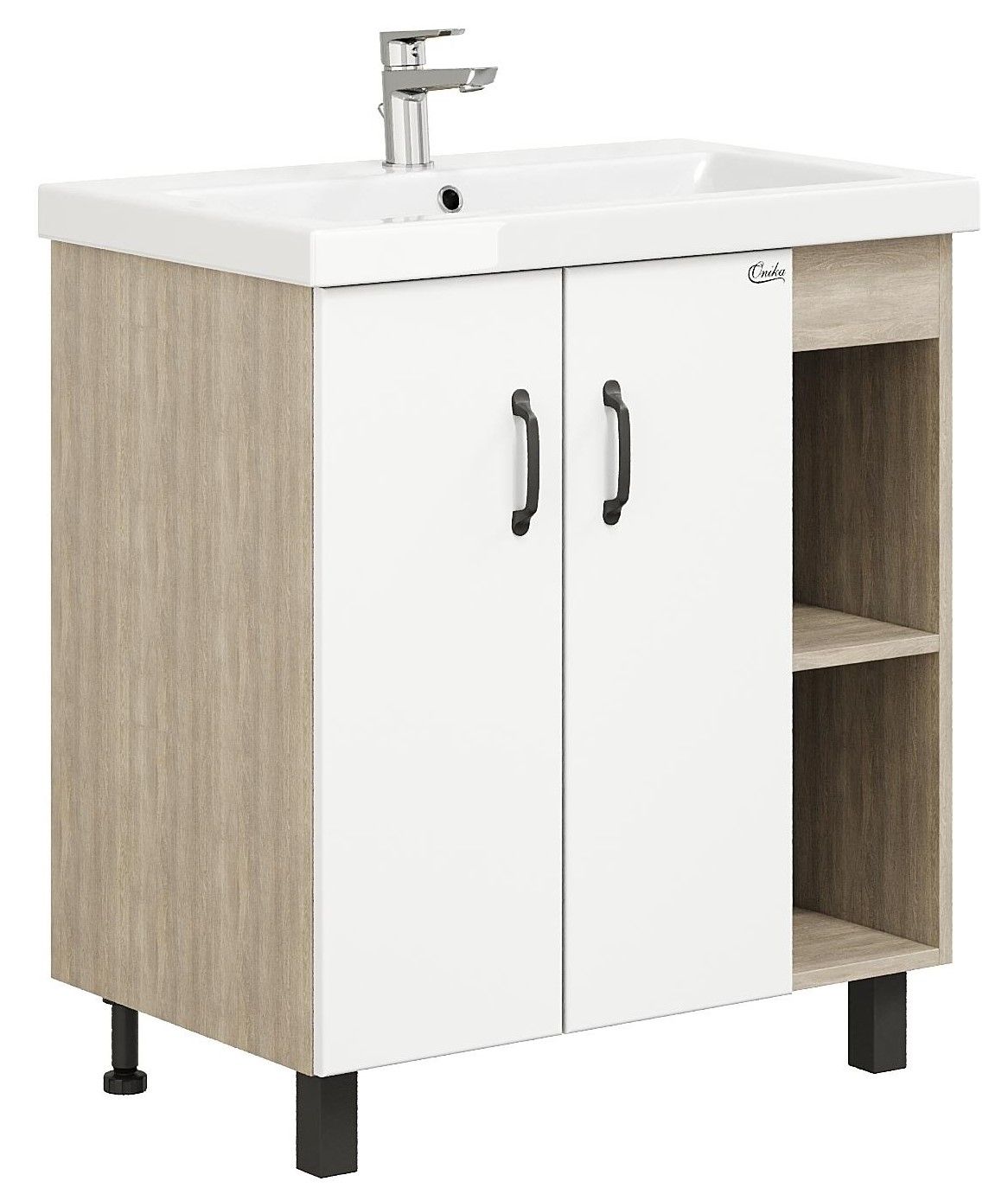В тумбе Onika Тимбер 70 удачно сочетаются контрастные цвета и фактуры: белый матовый фасад с покрытием SoftTouch, корпус цвета дуба с роскошной текстурой, черная матовая металлическая фурнитура.
