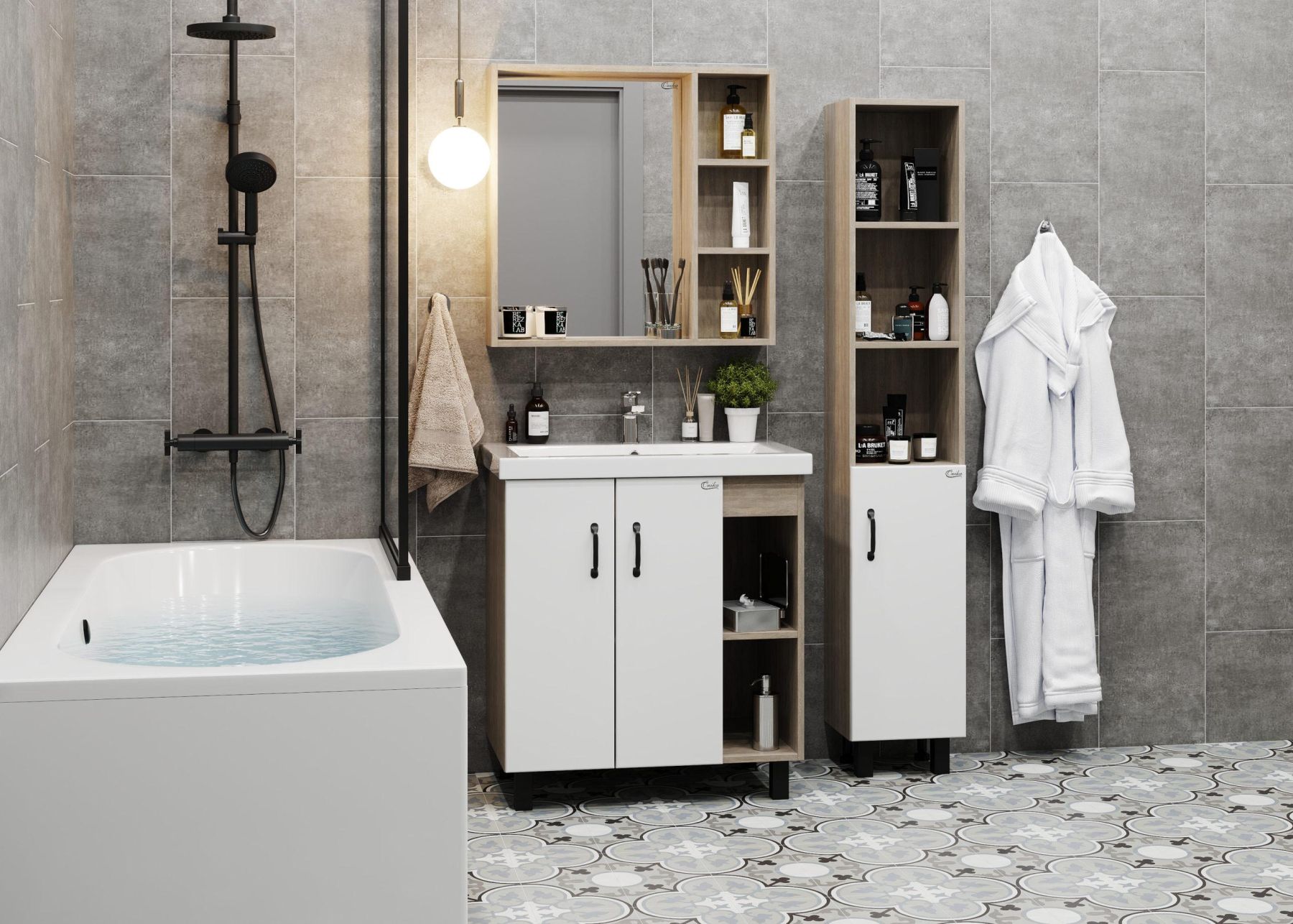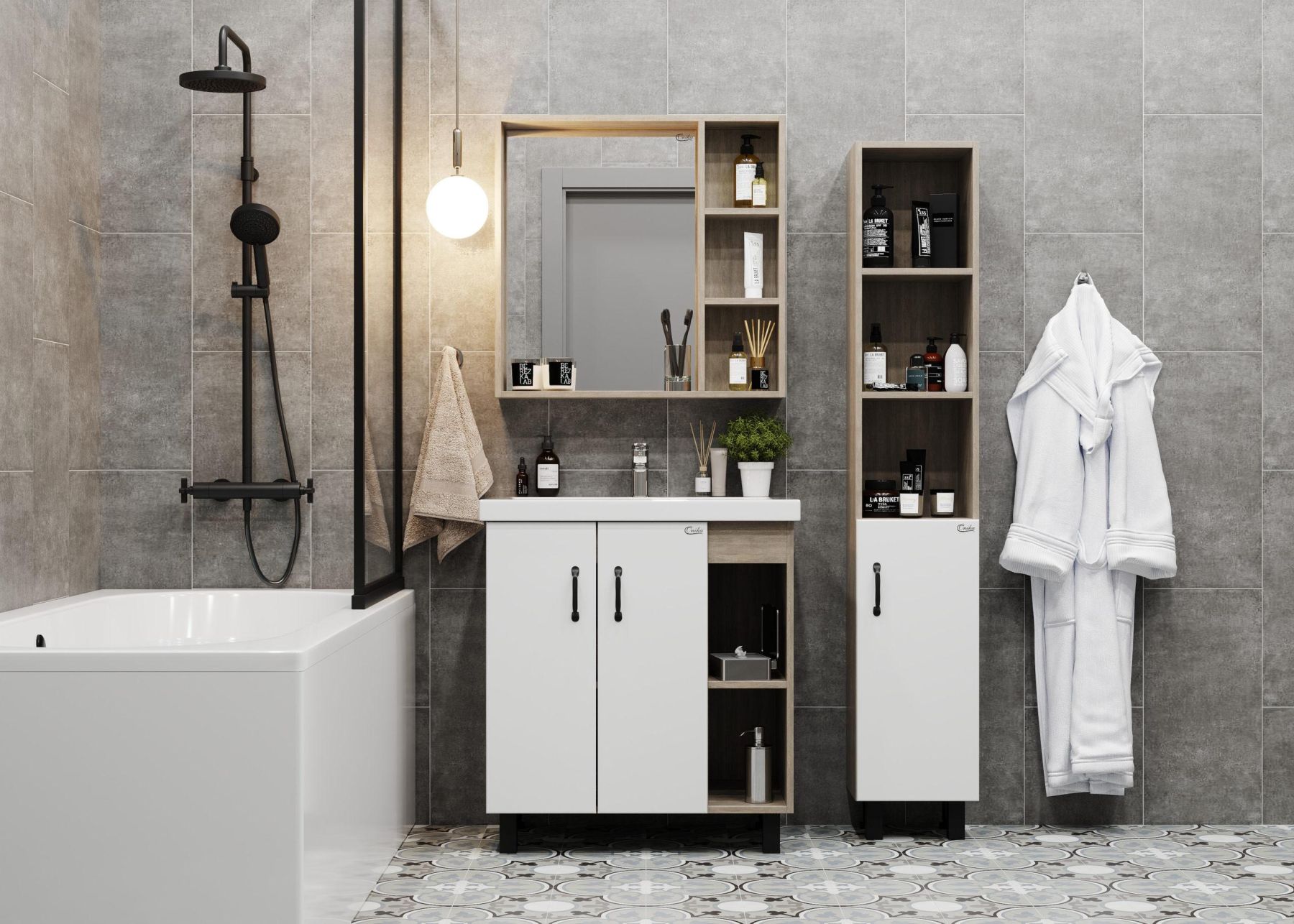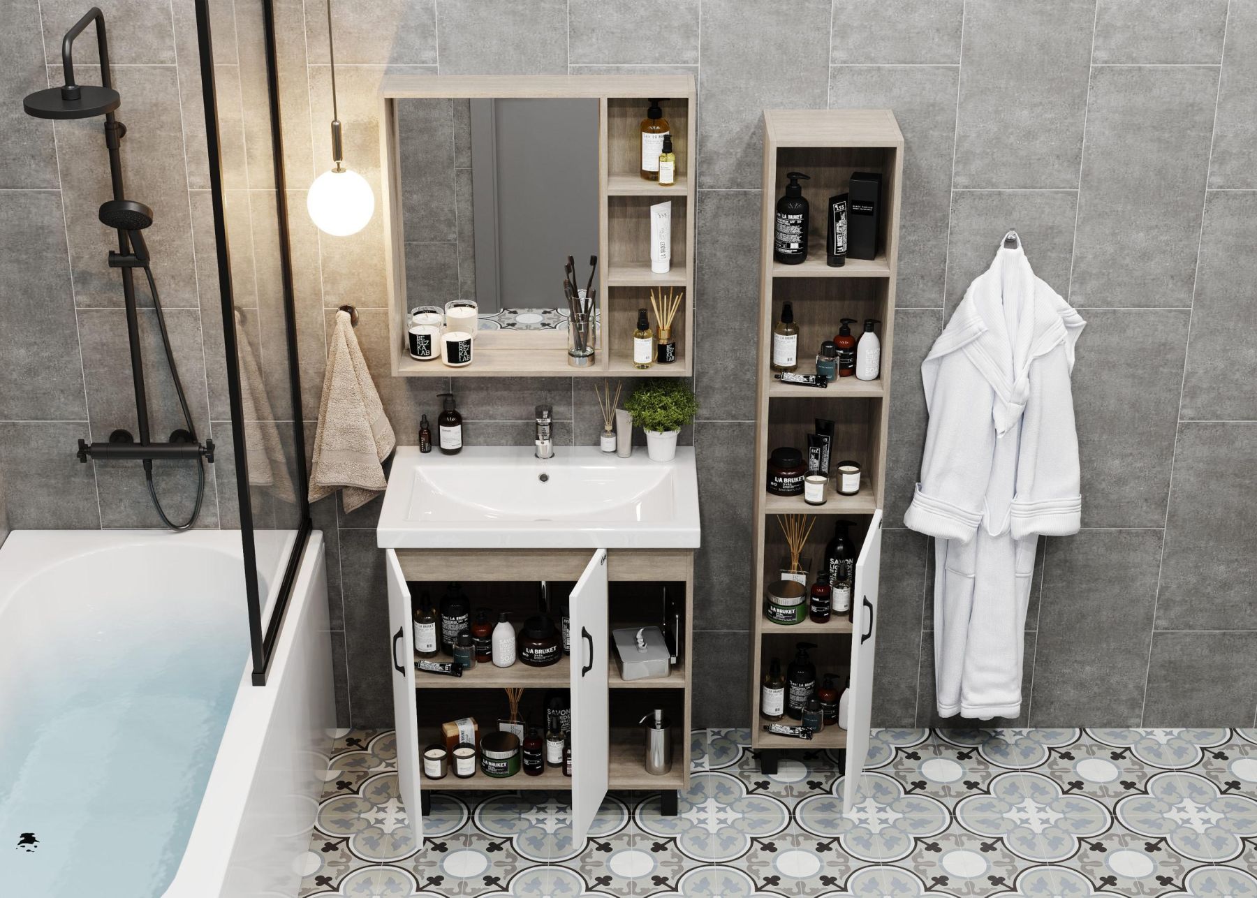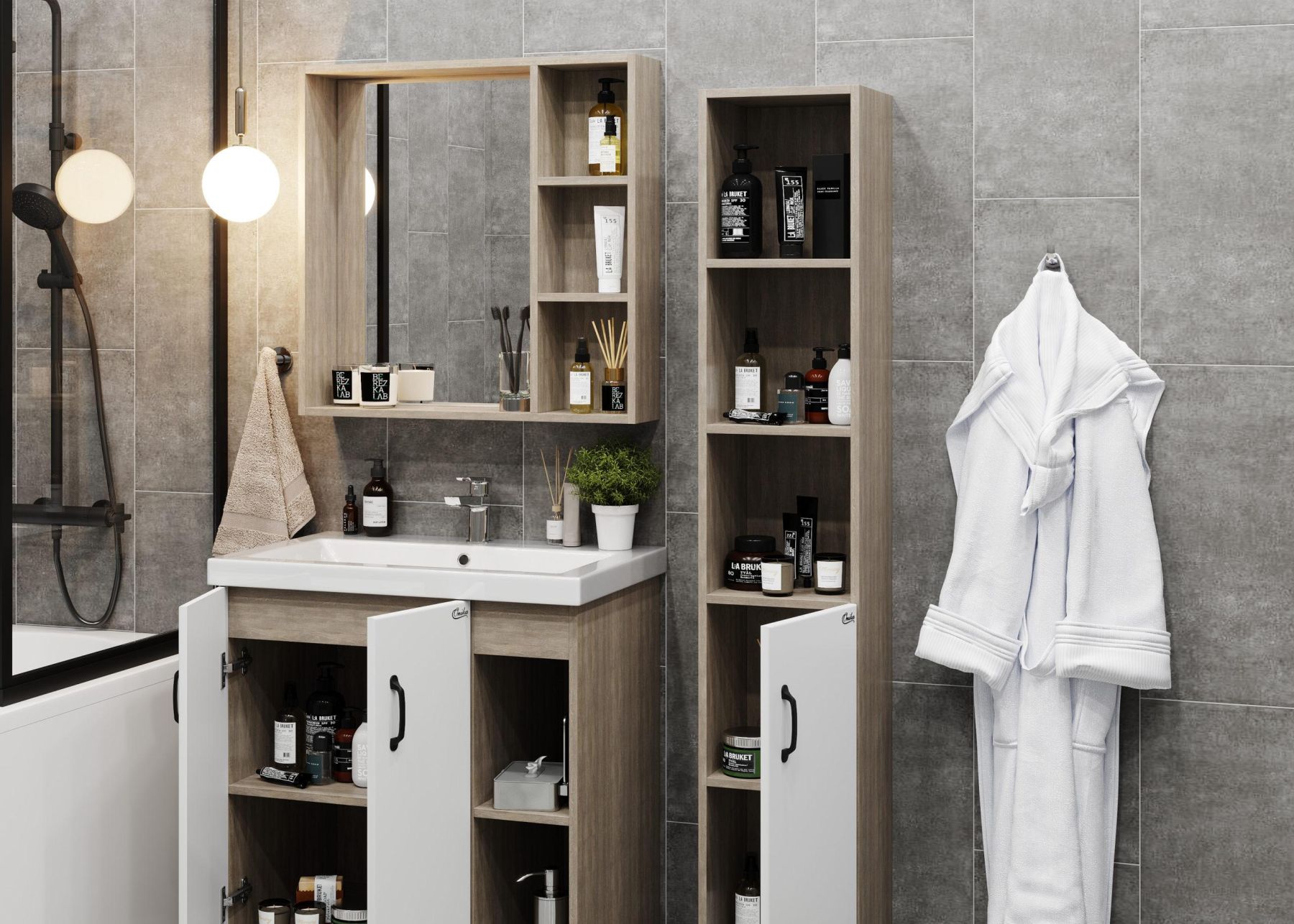 Открытые полки справа обеспечивают быстрый доступ к часто используемым аксессуарам, а пространство за распашными дверцами слева, снабженными системой плавного закрывания, станет удобным местом для хранения различных бытовых принадлежностей.