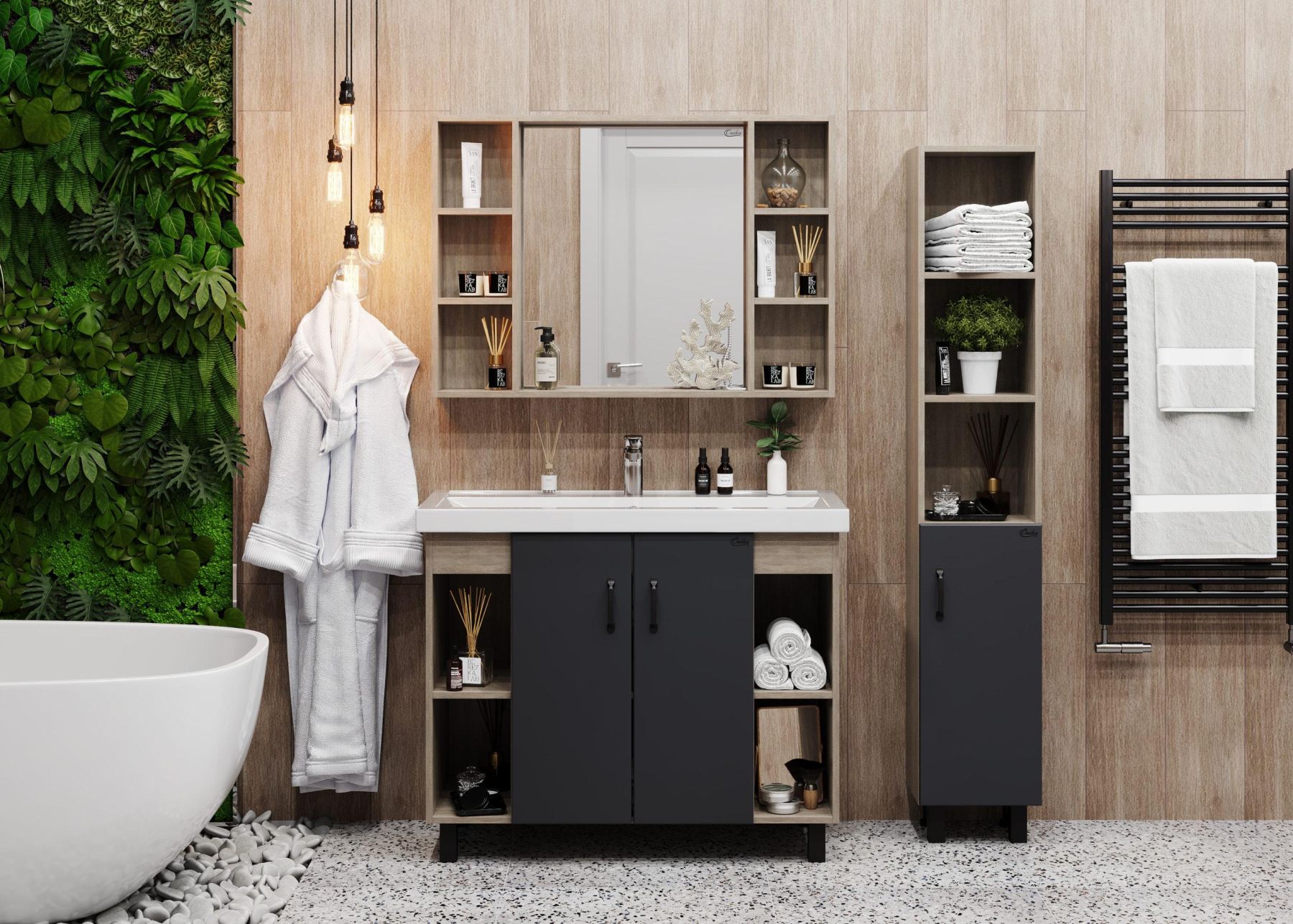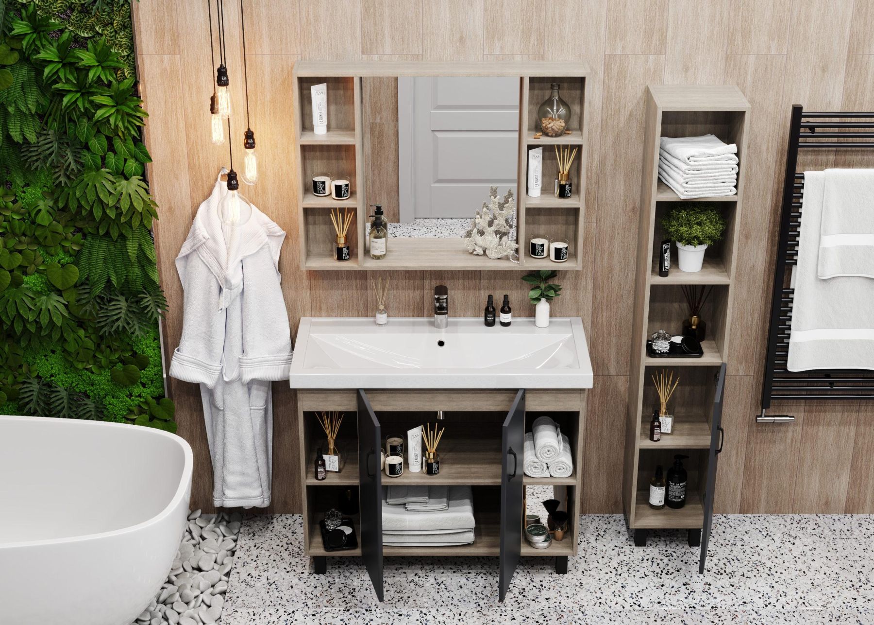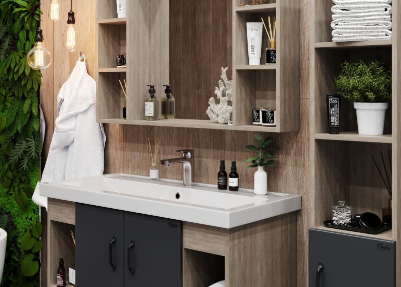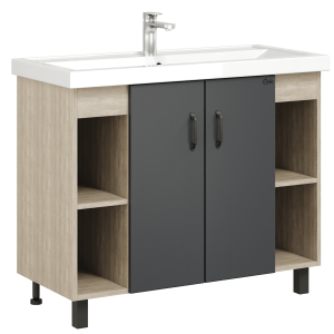 Открытые полки по бокам от основного отделения обеспечивают быстрый доступ к часто используемым аксессуарам, а пространство за распашными дверцами с доводчиками по центру тумбы, станет удобным местом для хранения различных бытовых принадлежностей.