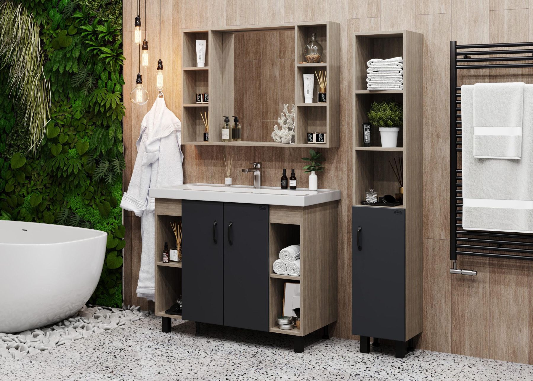 В тумбе Onika Тимбер 100 удачно сочетаются контрастные цвета и фактуры: серый матовый фасад с покрытием SoftTouch, корпус цвета дуба с роскошной текстурой, черная матовая металлическая фурнитура.