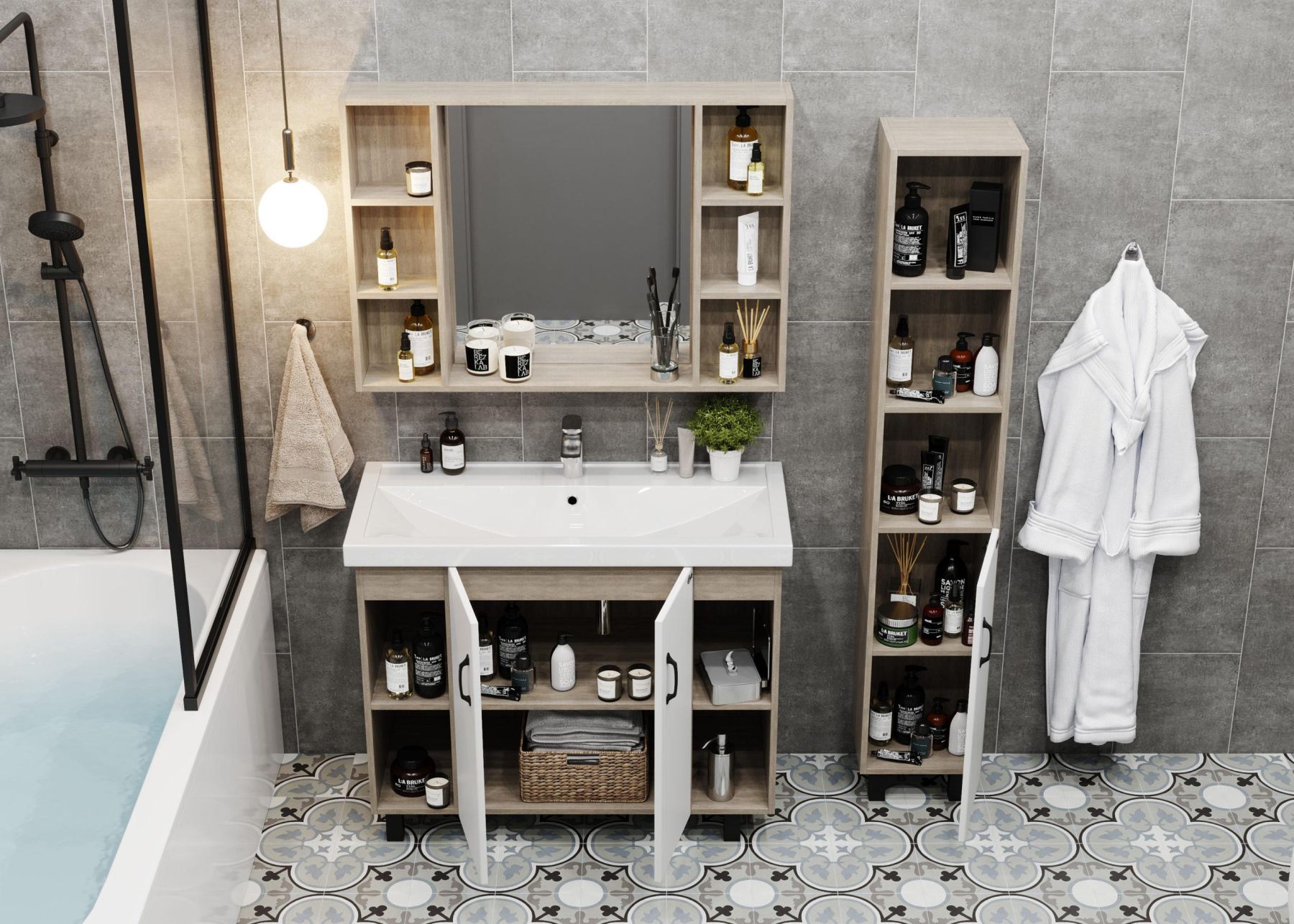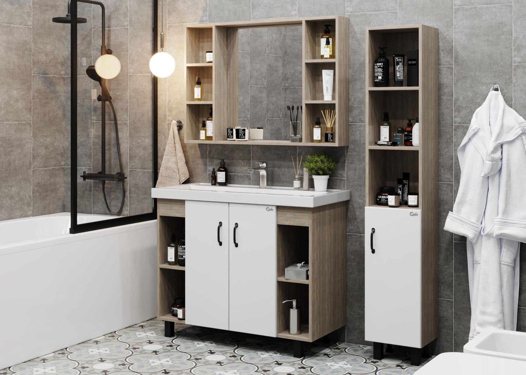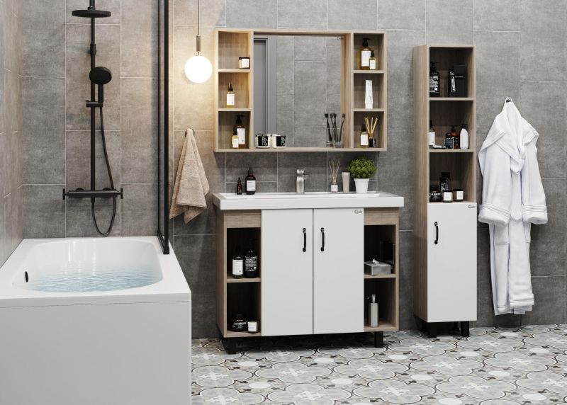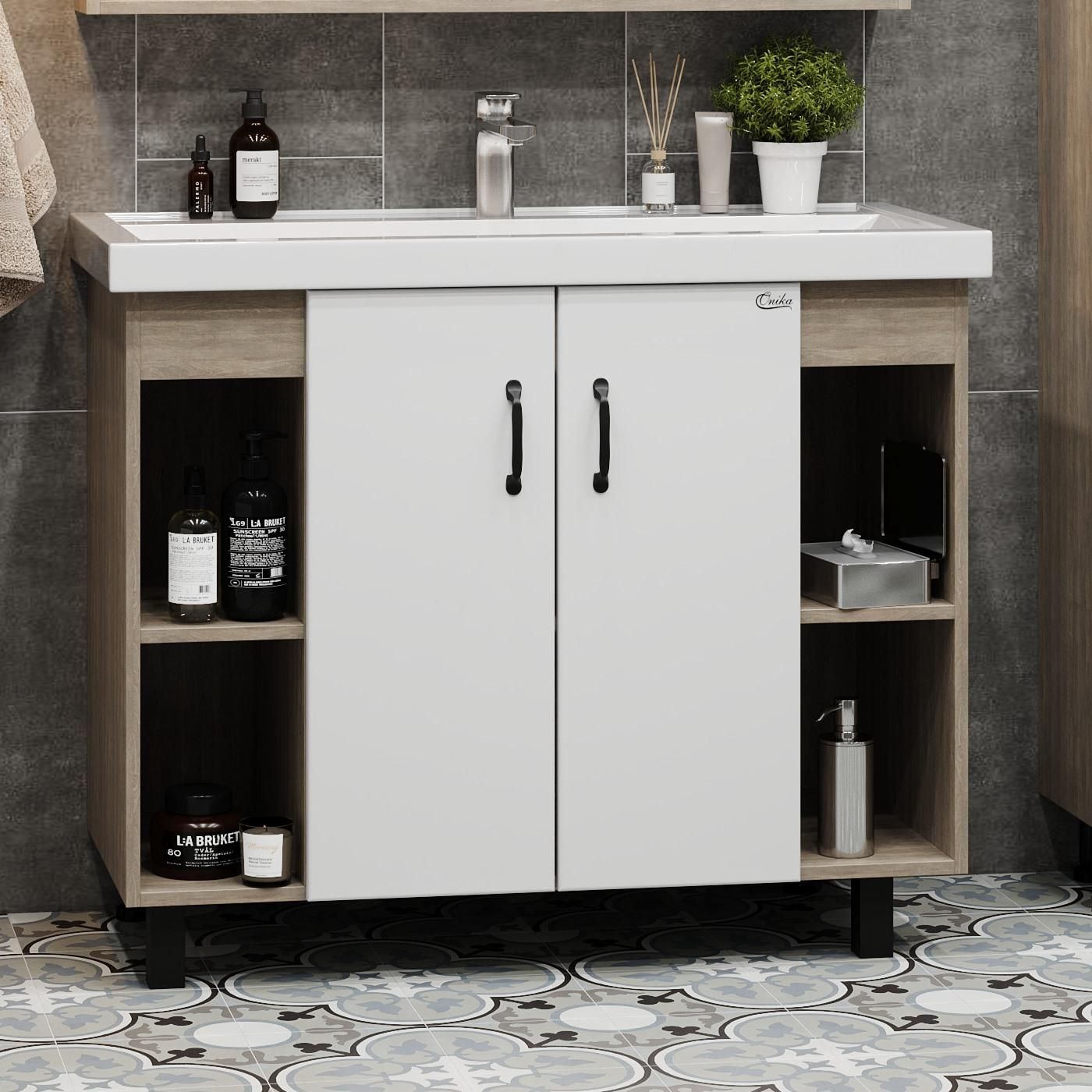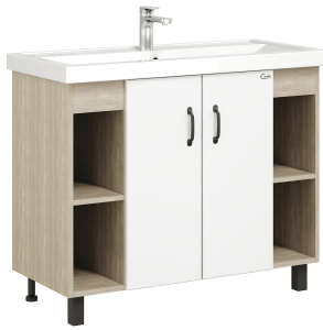 Открытые полки по бокам от основного отделения обеспечивают быстрый доступ к часто используемым аксессуарам, а пространство за распашными дверцами с доводчиками по центру тумбы, станет удобным местом для хранения различных бытовых принадлежностей.