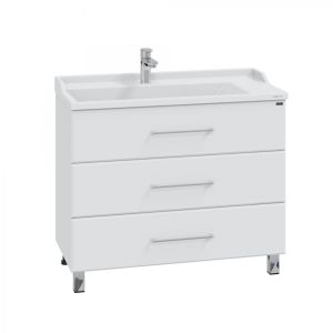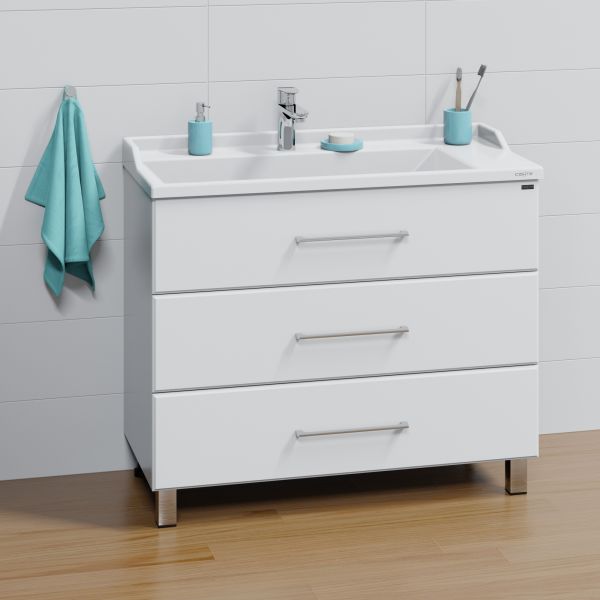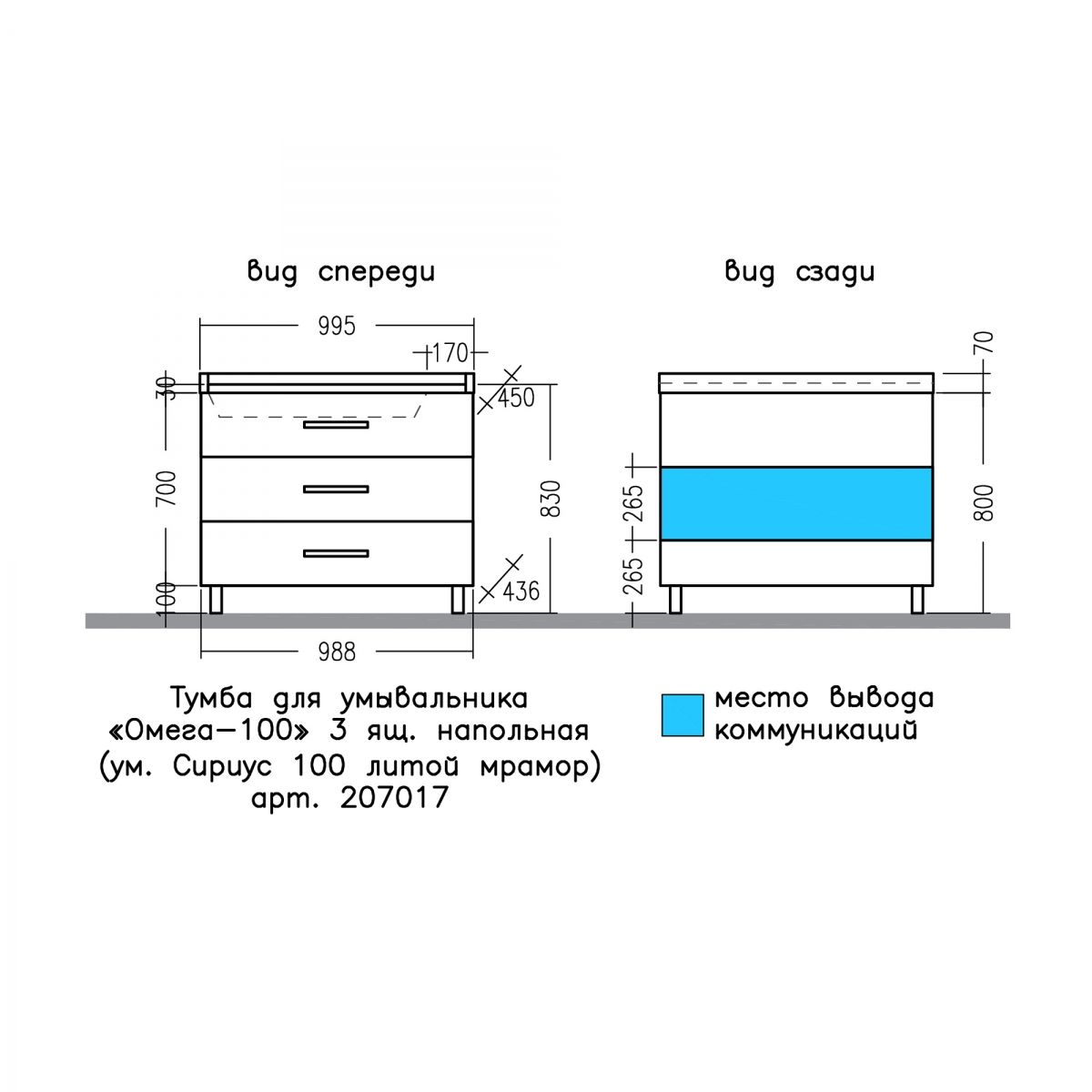 Тумба напольная Омега 100 для умывальника Sirius 100. Корпус изделия и фасад выполнен из МДФ. Фасад и боковины мебели покрыты глянцевой ПВХ плёнкой.Выдвижные ящики тумбы оснащены шариковыми направляющими полного выдвижения.
