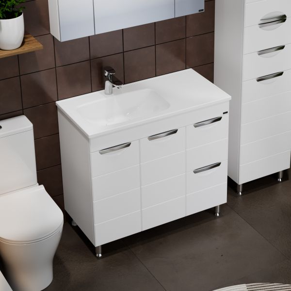 О коллекции: Коллекция Родос - современная и стильная мебель по приемлемой цене. Фасадные и боковые стенки мебели выполнены из МДФ покрытого ПВХ плёнкой. Тумба напольная "Родос 90" для умывальника "Венера 90". Тумба имеет оптимальную организацию внутреннего пространства. Комплектуется современной прямоугольной раковиной из литьевого мрамора с удобным крылом.