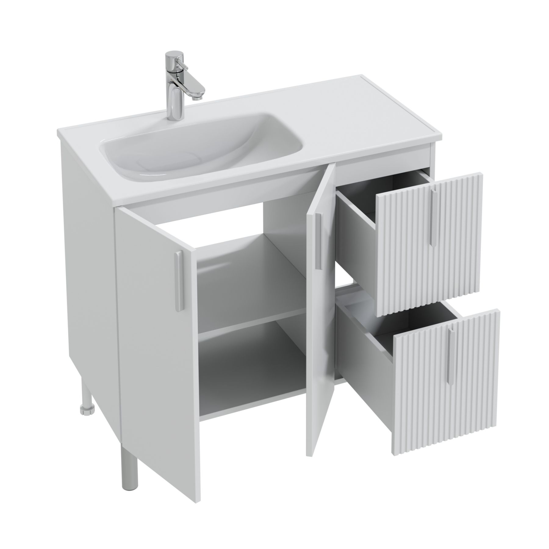 В комплекте с тумбой идут четыре стильные ручки и пять высоких ножек, которые обеспечивают надёжность и устойчивость всей конструкции.